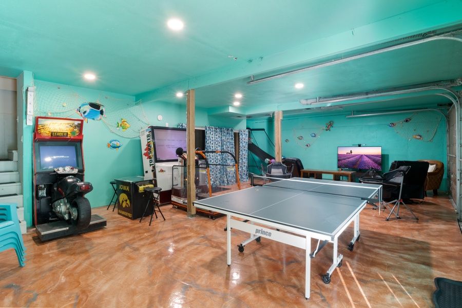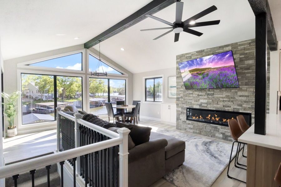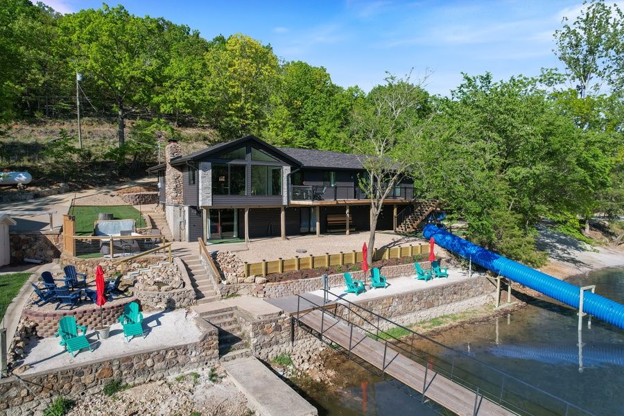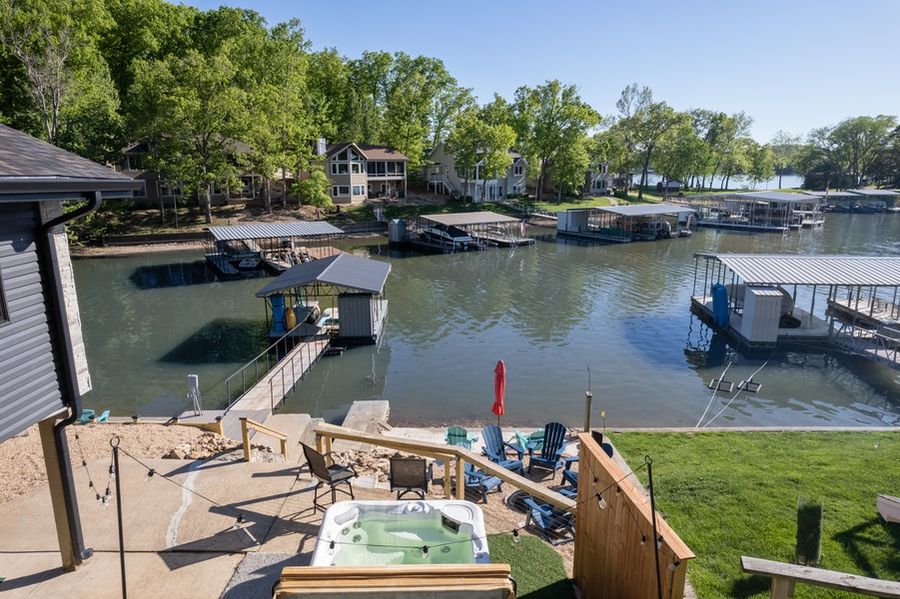 Absolutely everything you need for an epic lake vacation! Fire pits, hot tub, slide, beach, kayaks, sand volleyball, arcade room - Water's Edge has it ALL! Enjoy great space in the main house and guest house. Cozy up by the electric fireplace or unwind at the bar. With two homes connected by a country lane you'll have plenty of space for generations to gather. Experience it all at Waters Edge on Burning Bush Drive!" Nestled in a quiet cove, you'll feel at ease letting kids play on jet skis and kayaks, and more for everyone at Waters Edge!