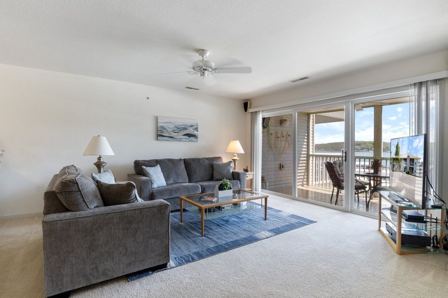 Cozy condo unit offering breathtaking views of the main channel from both the living room and master bedroom w/ inviting decor and layout perfect for those who prefer minimal steps. The screened-in deck provides a comfortable outdoor space to relax and enjoy the view, plus, family-friendly fun with games and puzzles suitable for various ages. Ideal for guests seeking to enjoy the lake and community -and explore nearby attractions w/ plenty of activities and access to the lower pool area!