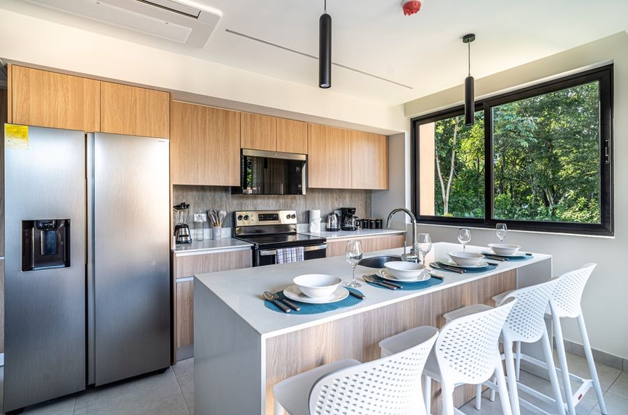 The apartment features two spacious bedrooms with premium linens, ensuring restful nights, and two modern bathrooms stocked with all essentials. The fully equipped kitchen makes it easy to prepare meals, whether it's a quick breakfast or a family dinner. Relax in the bright and airy living room, or step onto the private balcony to enjoy the tropical breeze. High-speed Wi-Fi, air conditioning, and a washer make your stay comfortable and convenient.