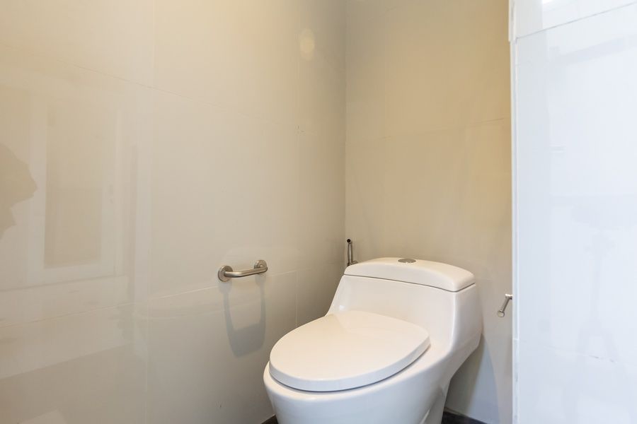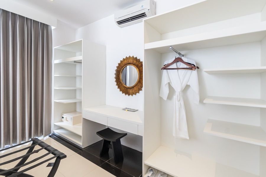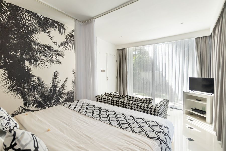 The living room, located before the main bedroom, provides a welcoming space to relax. The main bedroom offers easy access to the pool, its own living room with a sofa and TV, and a large closet space behind the bed. Additionally, it features a luxurious bathtub and an outdoor shower for ultimate relaxation. The second bedroom includes a spacious work area, ideal for productivity.