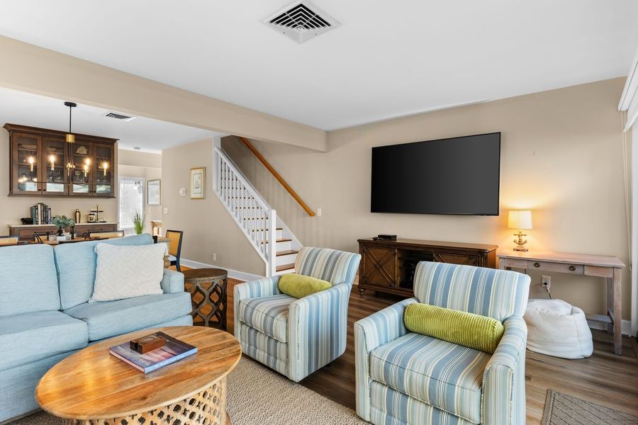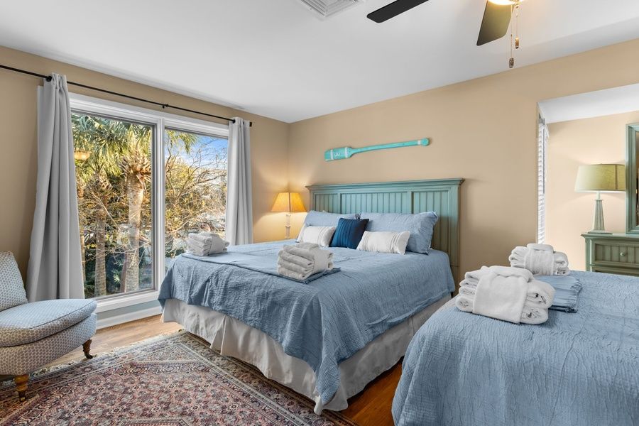 Wide plank flooring guides you from the entry courtyard and into the beautifully updated living spaces, centered on views out to the water. Dining for six beneath a chandelier transitions to a superbly comfortable living room, with sectional sofa and dual armchairs facing a flat-screen TV beside a wall of sliders. Step through those sliders, and you’re soaking in sparkling Calibogue Sound scenery from a shaded patio with outdoor seating for four.