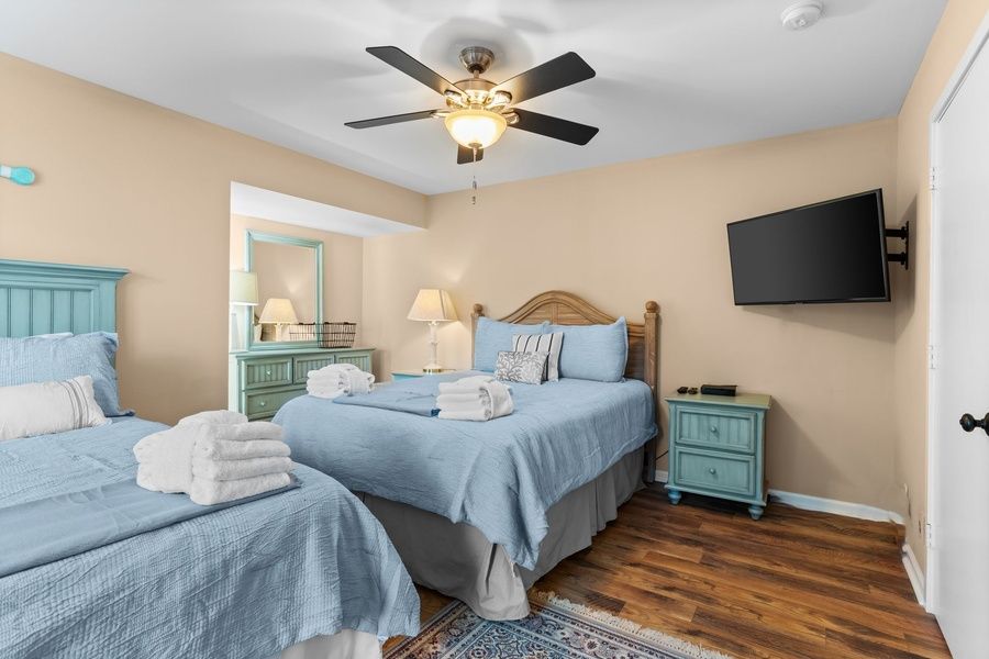 Atop the two-tone stairs, a pair of suites flank a wide hallway with concealed washer and dryer for all the convenience of home. The king suite at one end enjoys lush spaciousness along with ceiling fan, flat-screen TV and ensuite bath with walk-in shower. The king and queen suite opposite benefits from a private balcony gazing out on the sound, with a ceiling fan, flat-screen TV and ensuite bath with tub and shower rounding out the luxurious amenities.