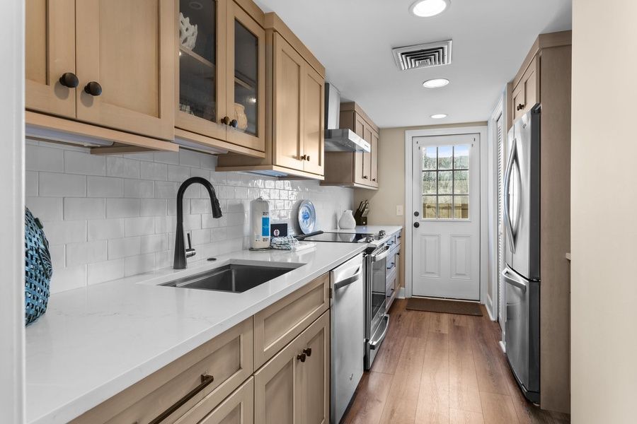 Equally adept at entertaining, a wide sidebar in the dining room segues into the galley style kitchen with solid surface counters and a full suite of updated appliances including flat cooktop stove.