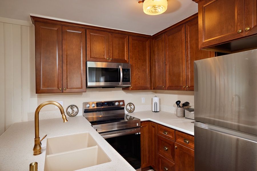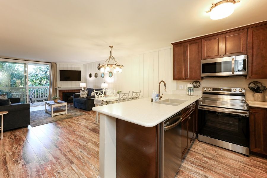 Come and enjoy life by the seashore at this charming beach condo with a nautical theme. Upgraded with luxury vinyl flooring and quartz counters, this cozy hideaway's living room is complete with a queen size sofa bed and two comfortable chairs. The kitchen was fully remodeled in May 2022 with quartz countertops, new cabinets, and new appliances. The bedroom features a king size bed. A lovely garden view is seen from the balcony. The A building has its own pool, jacuzzi, ping pong, barbecues, and laundry facilities. You are also welcome to use all the amenities of North Coast Village including exercise rooms, saunas, putting green, and an additional pool and spa.