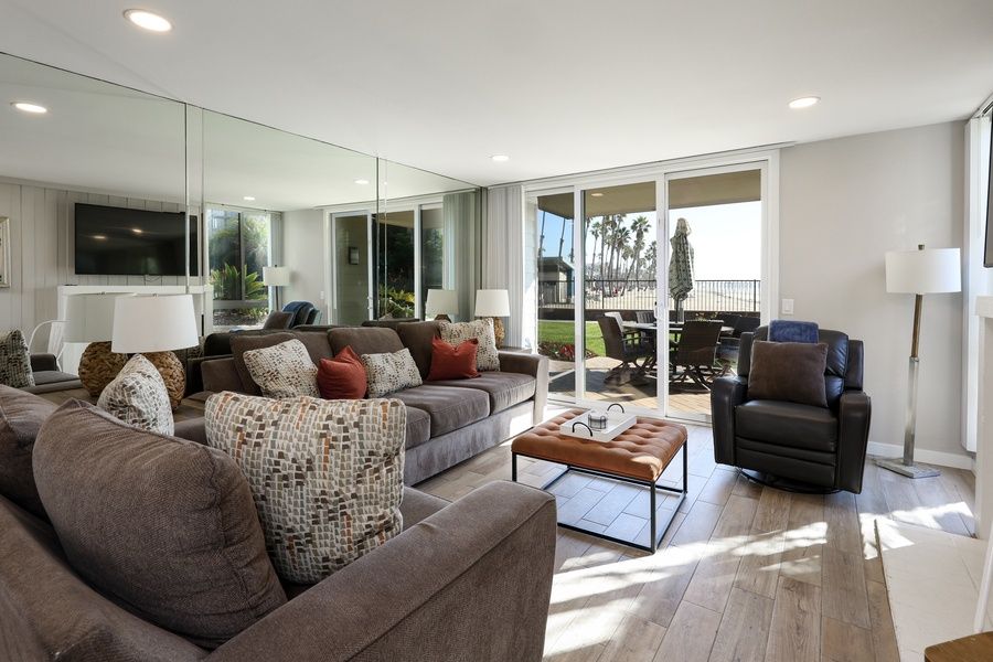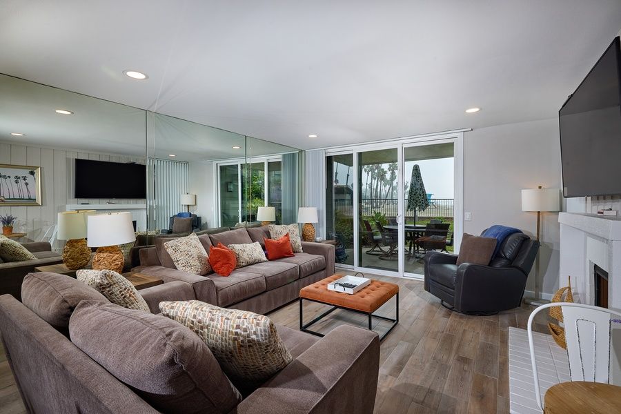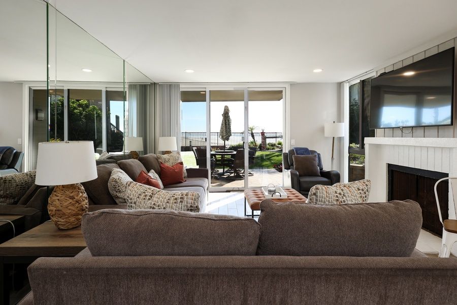 WOW! Ocean Views for Miles! This is one of the prime locations at North Coast Village, looking straight down the beach to the Oceanside Pier from your own patio and grassy yard! The charming living room is a delightful and comfortable retreat after a day fun in the sun and waves, with a queen size sofa bed, love seat, and recliner. A cozy fireplace completes the warm and colorful ambiance. Breakwater Beach Cottage is a corner unit, which means it has extra windows for additional light.