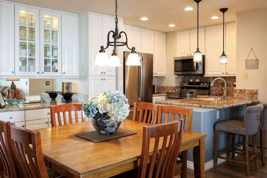 The beautifully updated kitchen features granite counters and backsplash, new cabinets, and stainless steel appliances. It's fully equipped for cooking to your heart's content! The rustic ocean-view family dining table seats 6, plus two barstools at the counter. You'll find an ample selection of dishes and serving pieces in the built-in china cabinet. Sleep in comfort with a New (2023) Posturepedic Plus