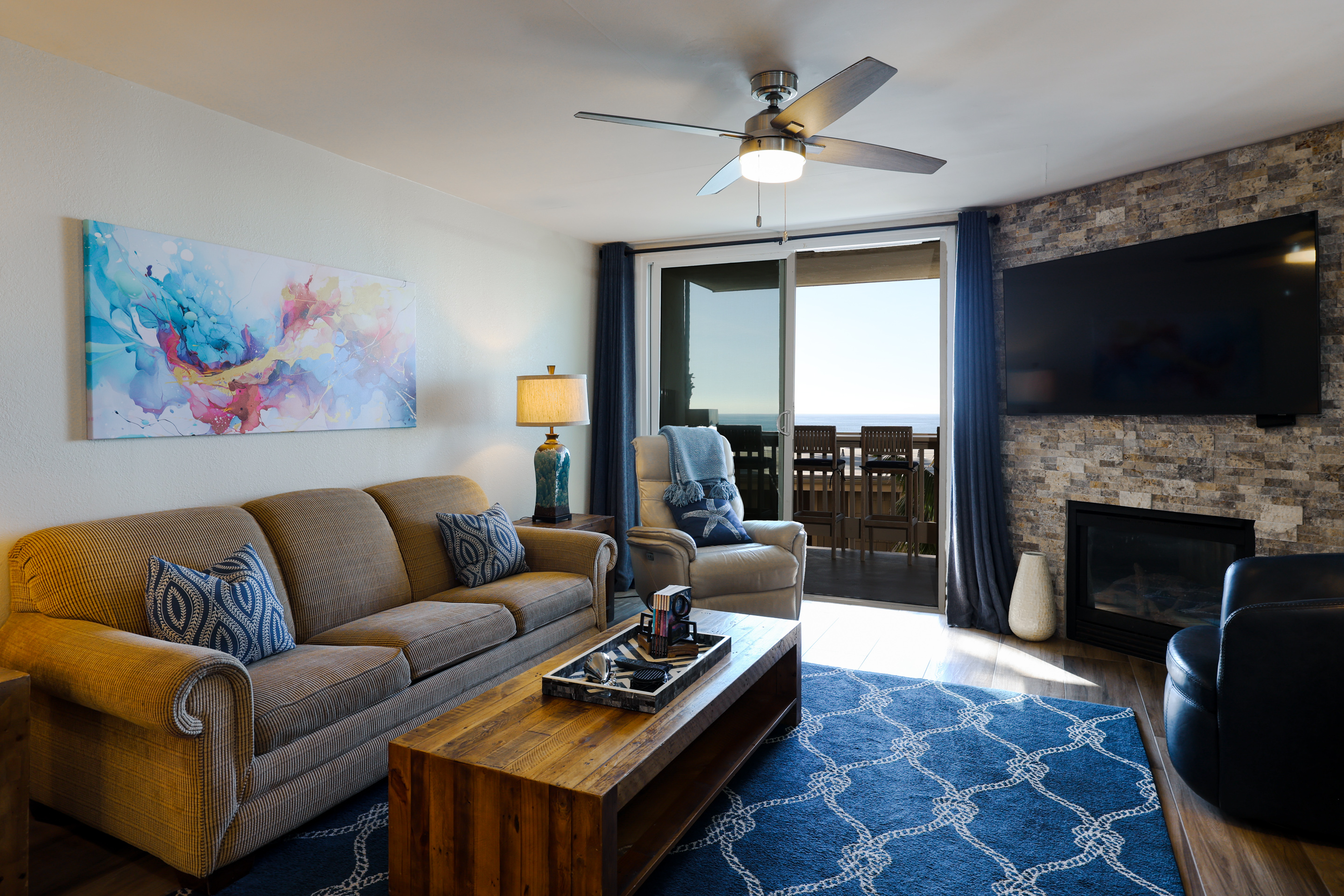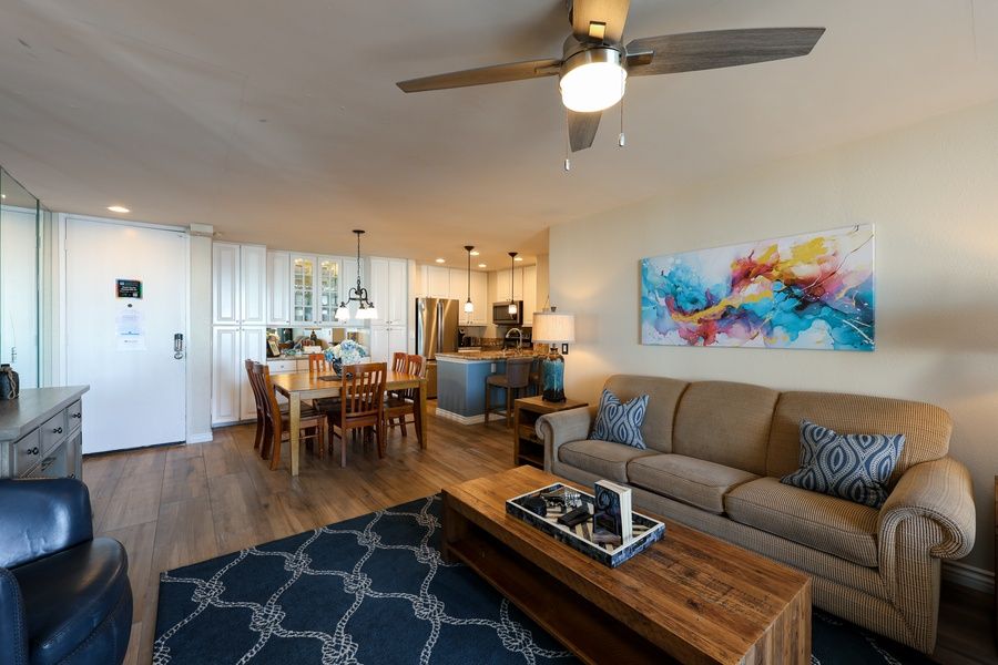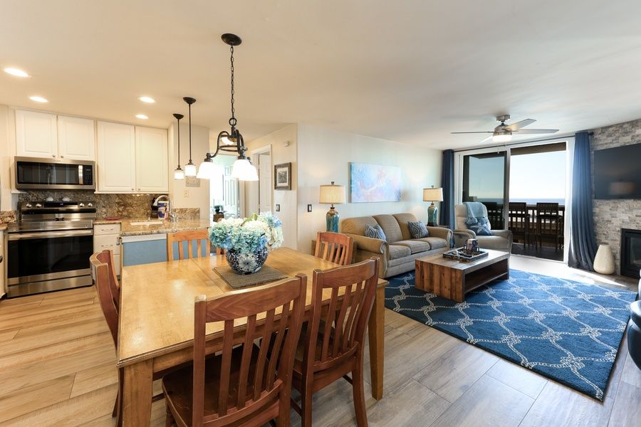 Breathtaking views of the ocean, sand and pier are yours to enjoy from this direct west-facing, corner two-bedroom condo with gorgeous decor! One of the few condos at NCV with west-facing ocean views AND south-facing pier and beach views - and it's all on one level! This unit has absolutely stunning interior and soothing nautical theme ocean colors. The living room is furnished with a La-Z-Boy sleeper sofa with a queen size memory foam mattress, a comfortable recliner, and 2 additional chairs.