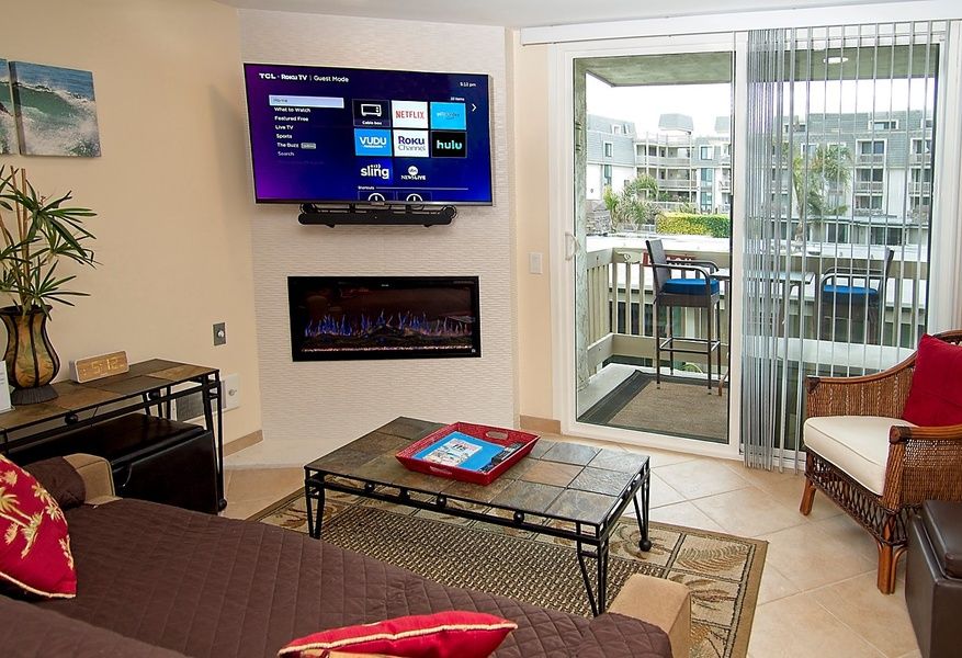 The living room has newly-added recessed lighting. The beautifully redesigned fireplace area now features a new electric fireplace and a 55” Roku TV, with access to cable as well as many additional streaming channels.