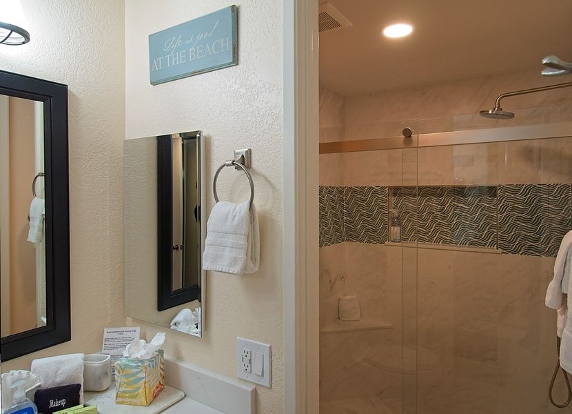 The bathroom now has a new, luxurious, custom shower. The separate vanity and dressing area have been tastefully remodeled, as well.