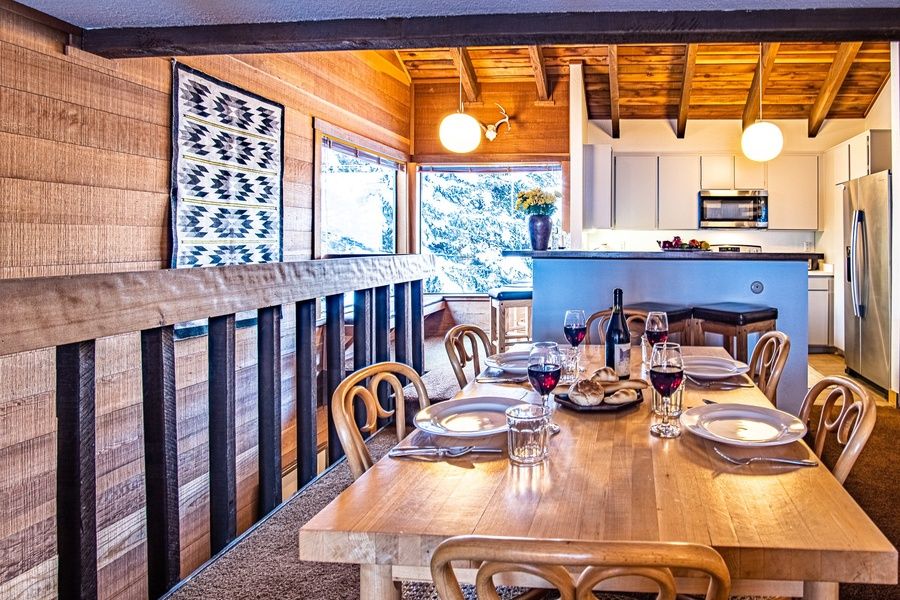 The cozy Sun Valley condo whisks you back to Sun Valley in the 1970s with a classic alpine ski vibe and timeless interiors. The living, dining and kitchen area is open with a large velvet sofa and vintage bucket chairs to kick back and relax, a wood-burning fireplace, and a flat screen TV. The kitchen is newly updated and fully-equipped for home-cooked meals (or quick snacks off the slopes!). Guests love the cozy nook with views of Dollar Mountain or there's seating for 5 at the breakfast bar and a dining table to seat 6 guests. Please note that due to fire restrictions this condo does not have a BBQ. Communal barbeques are available in the clubhouse.