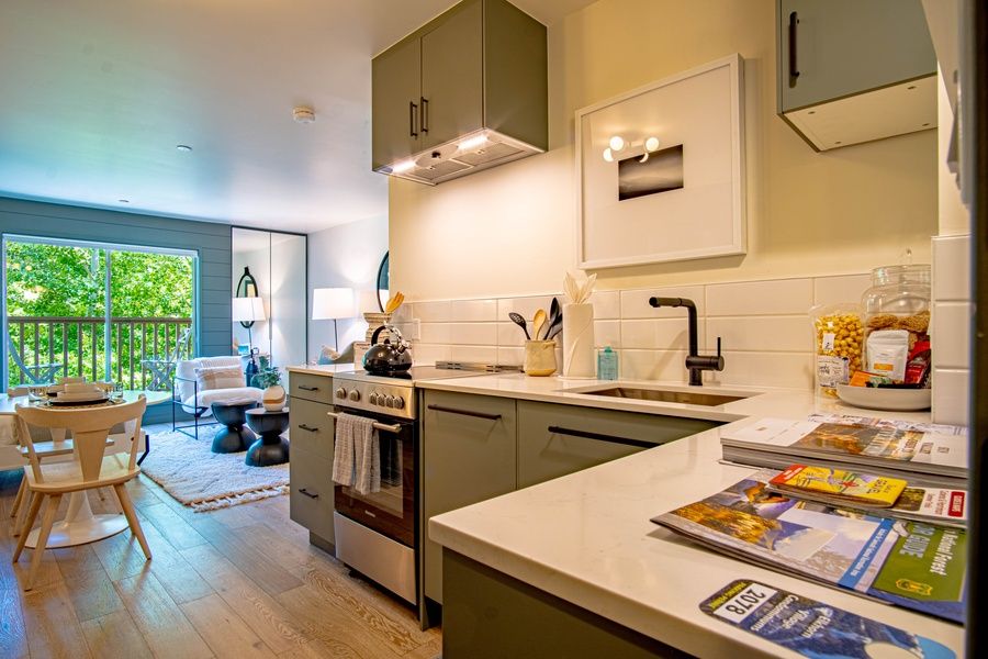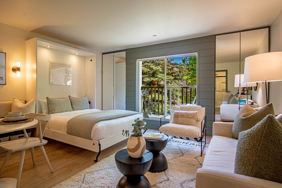 Step inside and you're greeted by natural light, curated textures, and a contemporary layout that makes the most of every inch. The queen Murphy bed folds neatly into the wall, giving you extra space to stretch out by the gas fireplace or catch up on your favorite series on the Smart TV. A full kitchen, rare for a studio, gives you the freedom to cook, snack, and sip just the way you like, and a private balcony lets you enjoy your morning coffee surrounded by trees and fresh mountain air.