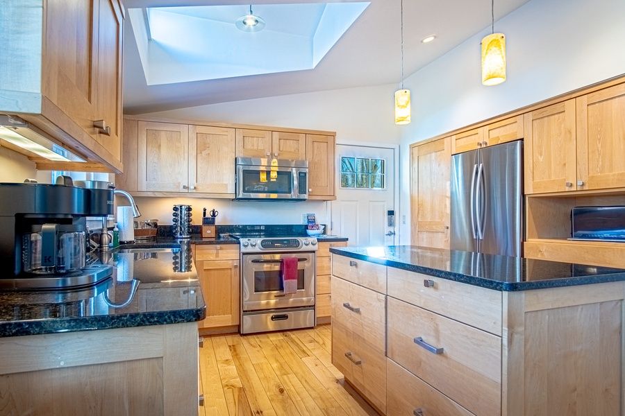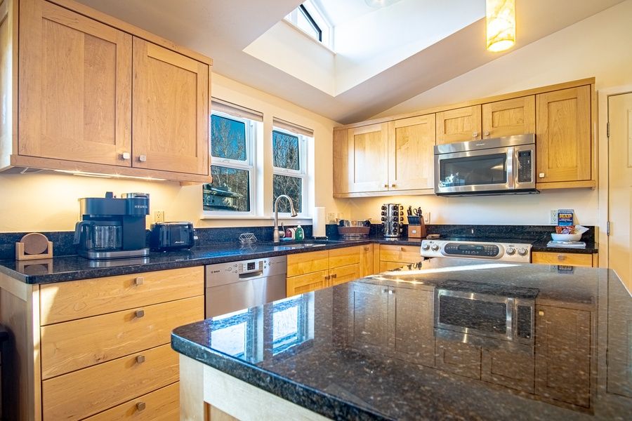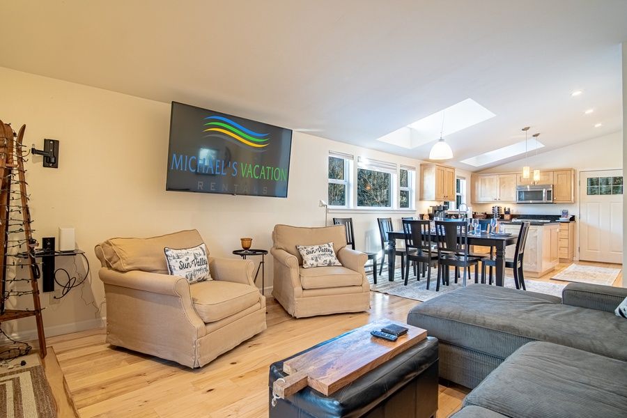 When you're not out adventuring, the open living area offers the perfect space to unwind. A glowing gas fireplace invites you to settle in and watch your favorite shows (or the big game) on the 65-inch TV, or cook up a storm in the modern kitchen, fully equipped for your stay. The dining area, with seating for 8, becomes the heart of shared meals, board games, and lifelong memories of your stay in Sun Valley. As the seasons change, step out to a private deck with outdoor seating, a fire pit, and a patio heater to create a cozy outdoor ambiance.