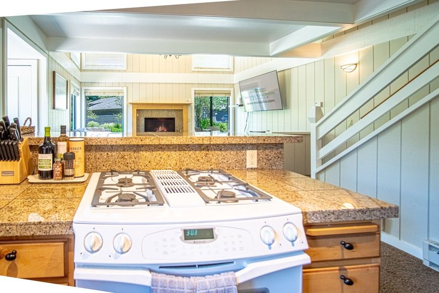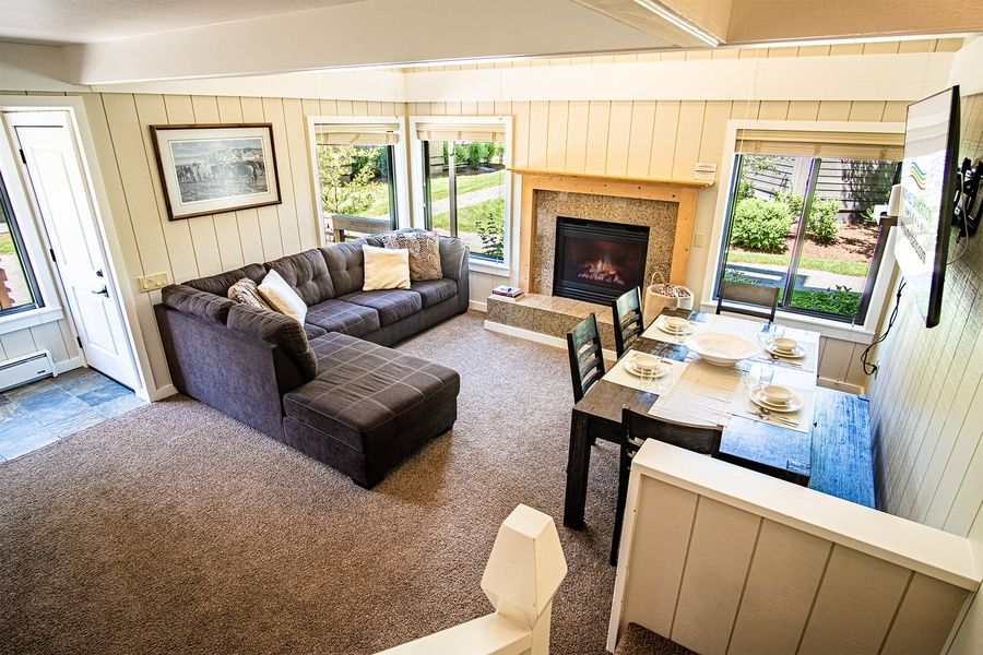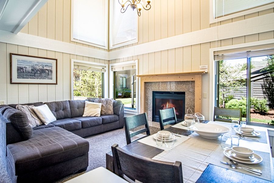 Step inside to a cozy mountain retreat with cathedral ceilings, a welcoming gas fireplace and a 70” Smart TV, perfect for movie nights and sports games! The open living area features a large sectional sofa and dining table for downtime, and a fully equipped kitchen for all your cooking needs. Outside, the spacious deck overlooking a tranquil pond is perfect for summer gatherings.