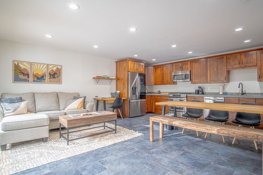 Walk to the Sun Valley Resort Ski Lifts & Audi FIS Ski World Cup Finals! Welcome to Warm Springs Base Camp, a newly renovated, modern 2BD + Loft townhouse-style condo, only a 2-minute walk to the Warm Springs Base Area of Sun Valley Ski Resort. The complex amenities are some of the best in Sun Valley! Guests have access to a heated swimming pool (summer only), three hot tubs scattered around the complex, a gazebo area with barbeques, a playground, tennis and pickleball courts, and Warm Springs Creek for flyfishing. Ski storage included! Warm Springs Base Camp offers the perfect blend of modern comfort and mountain serenity! The open living area features beautiful furnishings with custom handmade furniture, unique local art work, a large 12-unit ski boot, glove, helmet, and gear dryer, and a small desk should you need to mix business with pleasure. When you're not out discovering Sun Valley's 50+ local restaurants and cafes, the modern kitchen boasts stainless appliances, concrete countertops, and all the essentials for home cooked meals or alfresco dining on the furnished deck near the tranquil Warm Springs Creek. Barbeque grills are available in the communal gazebo area. 2 Bedroom + Loft Room – 2 Bathroom – Maximum 7 Guests: Warm Springs Base Camp accommodates a maximum of 7 guests. The primary suite has king bed, Smart TV, and ensuite bathroom with double vanities and a large double shower with a bench. The second bedroom offers a full bed, and the loft space is ideal for kids or additional guests with three Twin XL beds and a Smart TV for entertainment. For added convenience, a closet near the kitchen has a full stacked laundry center. Please note that the loft room is accessed through the second bedroom. Prospector Community Amenities: The Prospector Complex amenities are some of the best in Sun Valley! Guests have access to a heated swimming pool (summer only), three hot tubs scattered around the complex, a gazebo area with barbeques, a playground, tennis and pickleball courts, and Warm Springs Creek for flyfishing. Our Warm Springs Base Camp condo features ski storage and boot heaters for added convenience. Warm Springs Base Camp is a true home away from home, whether you're seeking winter thrills or summer tranquility amidst stunning landscapes. Just a 10 minute bike ride, 3 minute drive or free shuttle ride from Sun Valley Village and downtown Ketchum, you can effortlessly explore the world-renowned Sun Valley ski slopes, art galleries, restaurants, and amazing local events. In summer, embark on epic hiking adventures right from home, bike ride the 30-mile Wood River Trail, flyfish the Big Wood River, and so much more! Top attractions near Warm Springs Base Camp Warm Springs Ski Base Area: 200-300 yards - easy 2 minute walk holding skis or snowboard! Apples Bar & Grill: 200-300 yards Skiway & Creekside Bus Stop: 0.1 miles River Run Base Area: 3.5 miles Dollar Mountain Ski Lifts and Lodge: 4.3 miles Main Street Ketchum: 2.2 miles Sun Valley Visitor Center & Starbucks: 2.6 miles Sun Valley Lodge & Village: 3.3 miles Sun Valley Golf Club: 4.1 miles Elkhorn Golf Course: 5.4 miles Sawtooth National Recreation Area: 9.5 miles Galena Lodge: 25 miles Silver Creek Preserve: 34 miles Redfish Lake & Stanley: 63 miles Don't miss out on the perfect Sun Valley vacation rental. Warm Springs Base Camp offers a relaxing getaway, just minutes from world-class skiing, outdoor adventures, and the charm of Ketchum and Sun Valley. Book your stay in Sun Valley at Warm Springs Base Camp with Michael's Vacation Rentals today! Casago - Sun Valley has engaged VacayHome to ensure this listing contains all the information you need and that it is easy for you to book via search engines & online channels. VacayHome is connected directly to the property management system used by Casago - Sun Valley which ensures that availability & rates are up-to-date & accurate. When you book, VacayHome processes payment on behalf of Casago - Sun Valley and a charge will appear on your statement as "VacayHome". VacayHome will send you a confirmation e-mail that contains all the information you need to prepare for your vacation including arrival instructions. VacayHome has a 24 x 7 team to assist you with any questions or concerns you may have prior to arrival. To access VacayHome, obtain the customer support telephone number or read FAQs, please click on the links at the bottom of this page.