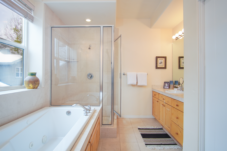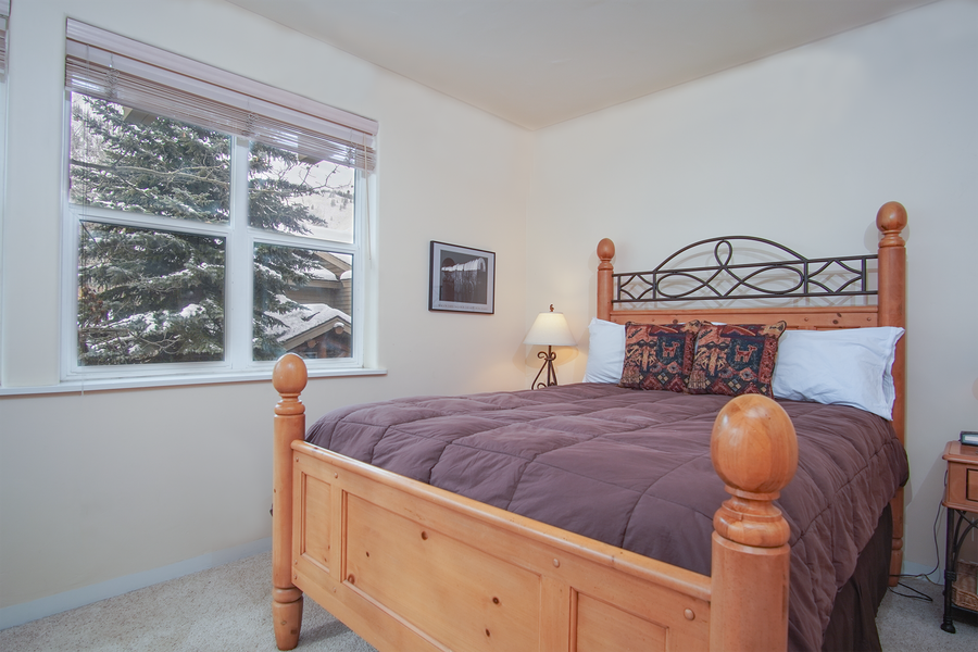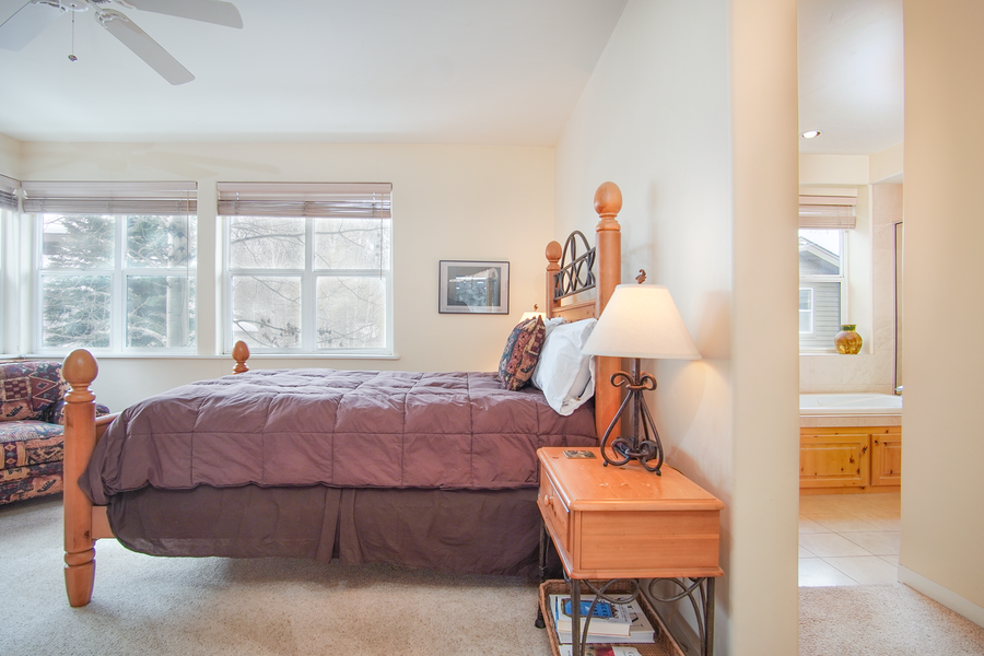 Sun Valley Town Home 215A accommodates up to 8 guests in 4 beautifully appointed bedrooms. The master bedroom is on the mid-level of the home and features a queen bed, a quiet sunny seating area for morning meditation, and a private bathroom with a whirlpool tub and separate shower. The second bedroom has a queen size bed, a private bathroom with a bath/shower combo, and access to a private patio. The remaining two bedrooms are on the ground level of the townhome, one with twin beds, the other with a set of bunk beds.