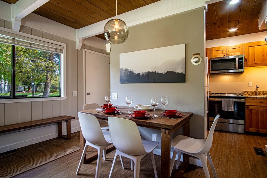 Inside, the warm and inviting living room offers the perfect spot to recharge. Light the wood-burning fireplace, stream a movie, or break out the board games for a cozy night in. The adjacent dining area and kitchen are fully stocked for home-cooked meals when you're not exploring the endless restaurants nearby in Sun Valley and downtown Ketchum.