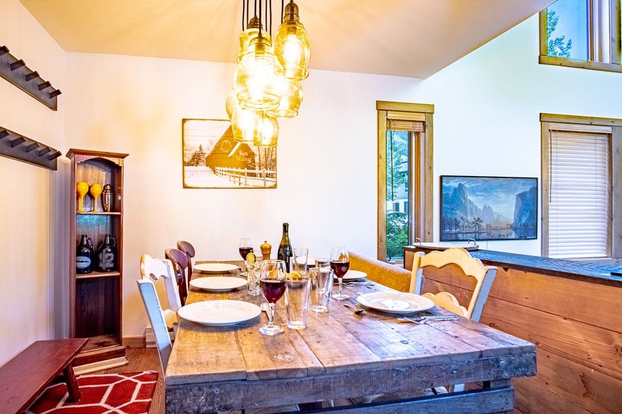 Step inside and this 3-bedroom, 3.5-bathroom Prospector condo has all your group needs for an epic vacation. The living area is open plan with big windows for natural light, double-volume ceilings for a sense of space, and ample seating around a river rock fireplace to relax and switch to mountain time. The kitchen caters well to a large group with a double fridge, dishwasher, gas stove, and bar seating to keep the chef company. The dining table seats all your guests, or take it outside for cocktail hour, a barbeque, and killer Sun Valley sunsets on the deck.
