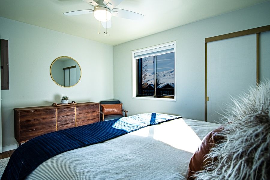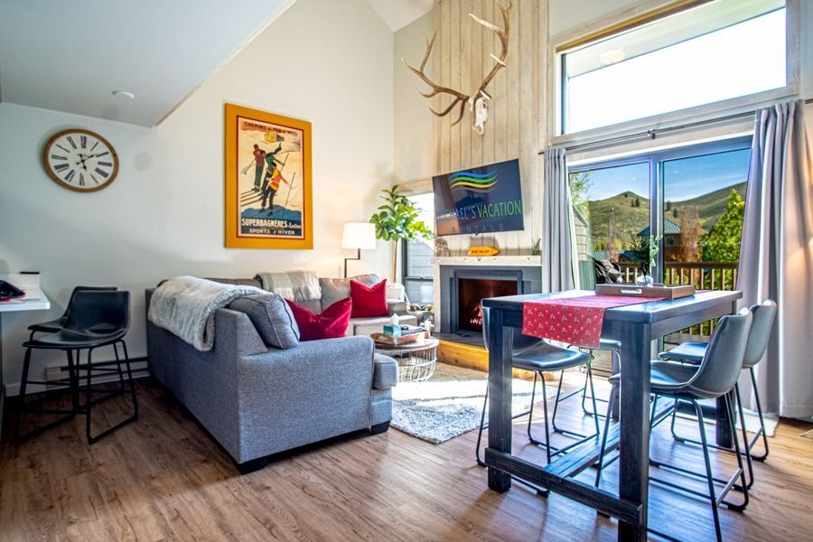 Bonne Vie is a second floor unit with 1,000 square feet of luxurious interiors. The living area is open with a plush sectional sofa around the fire and flat screen TV for downtime to end a day of Sun Valley activities and adventures. The kitchen is compact yet well-equipped with all the essentials to prepare meals, and a stacked washer/dryer when laundry duty calls. There is a six-seater dining table for sharing meals, but only for when you have to eat indoors!