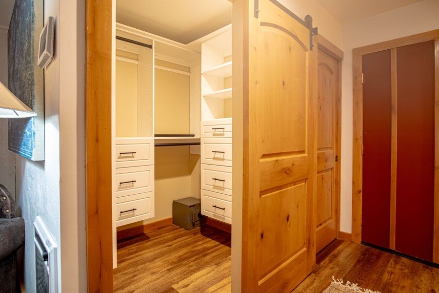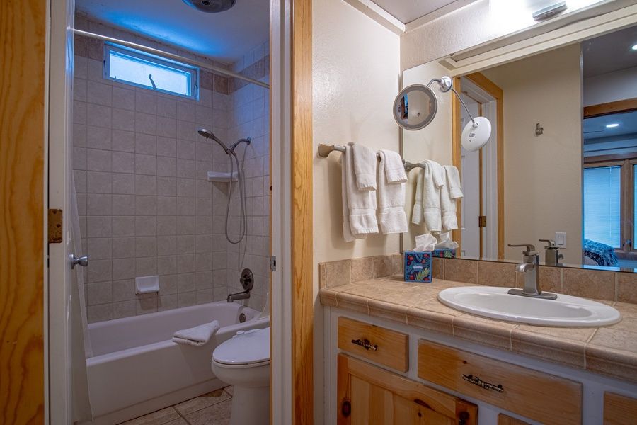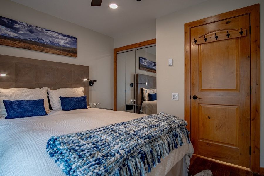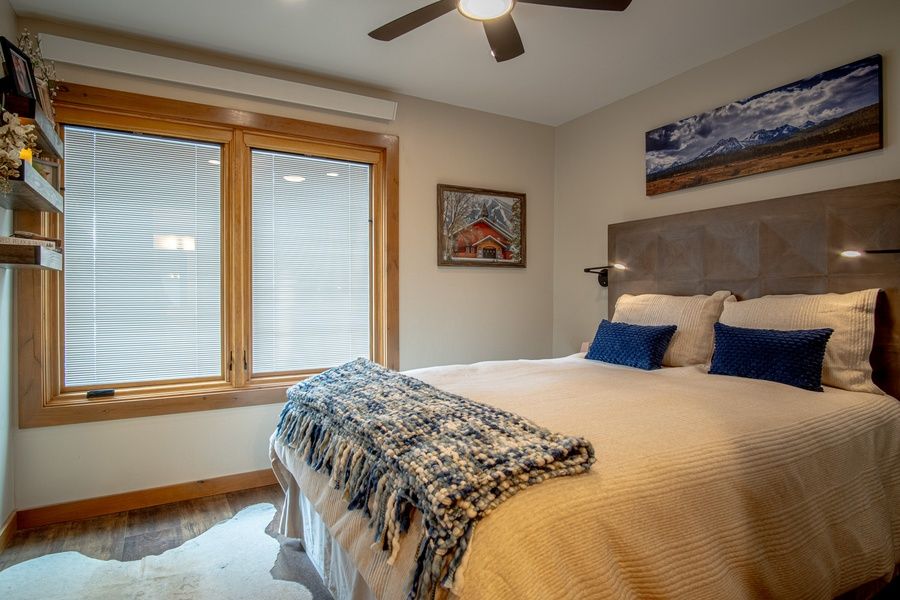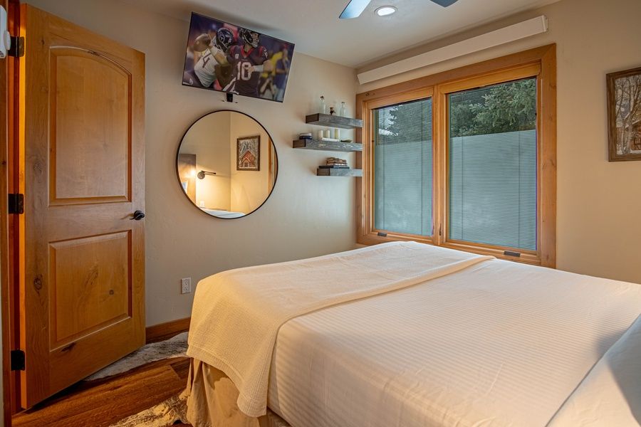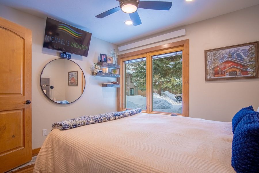 The master suite offers a queen size bed with all new linens, a ceiling fan for summer nights, a spacious closet and another flat screen TV for nighttime viewing...a bonus if you have a full house! The bathroom has a separate shower/tub & toilet from the lavatory. There is a convenient coat rack on entry for all your gear and a stacked washer/dryer for guest convenience.