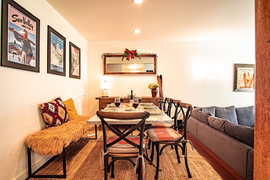 You're only a quick shuttle ride from the top-rated restaurants in Sun Valley and downtown Ketchum, but this condo is fully-equipped for at home meals. The galley kitchen features stainless steel appliances, ample counter space, and a cool stocked station for coffee lovers! The adjoining dining table seats 6 guests.