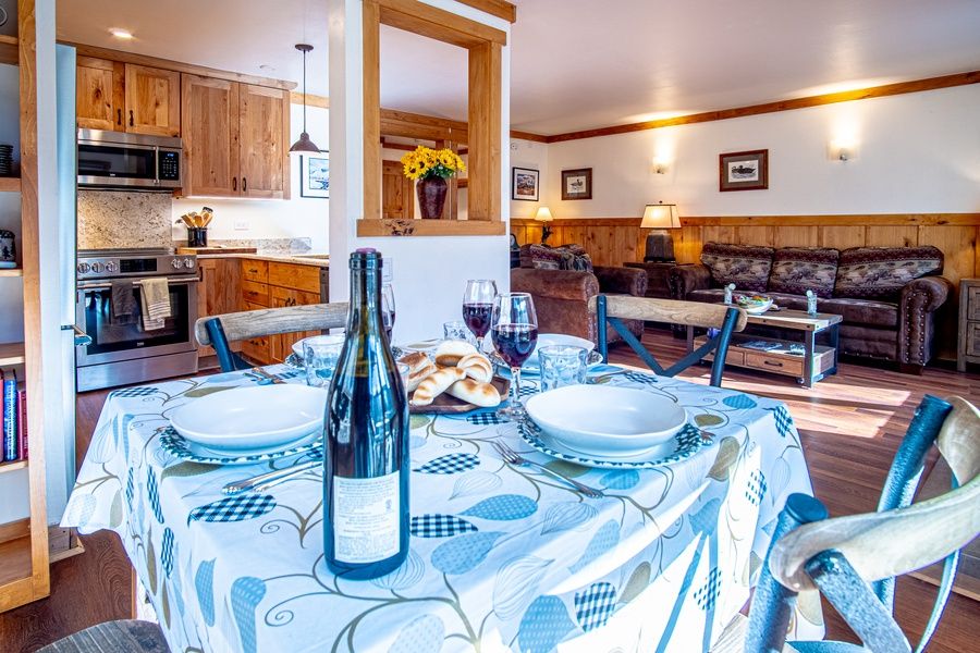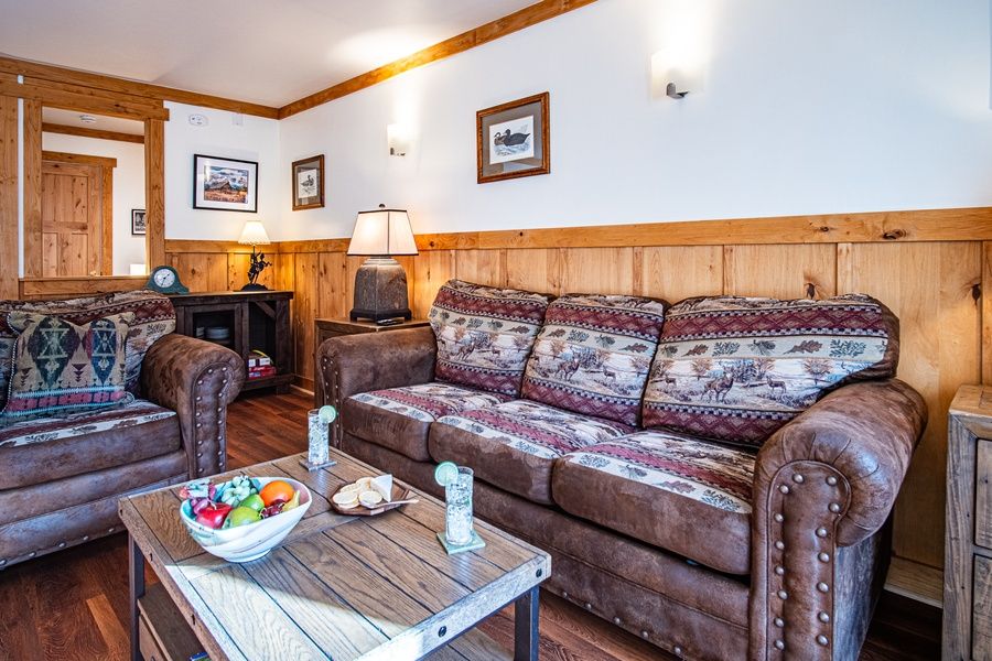 The open plan living area is centered around a cozy gas fireplace with large windows and doors facing onto the deck. A lodge-inspired leather sofa and chair with printed tapestry adds alpine appeal and invites you to sit, relax and switch to vacation time. The kitchen is fully-equipped to whip up your favorite home cooked meals with seating for 2 at the breakfast bar and a sunny dining area for 4 guests.