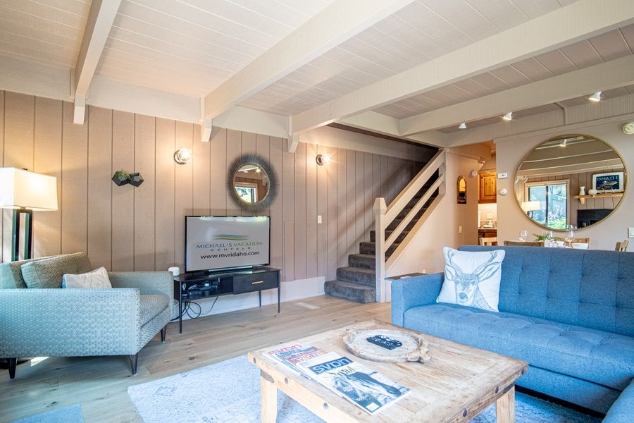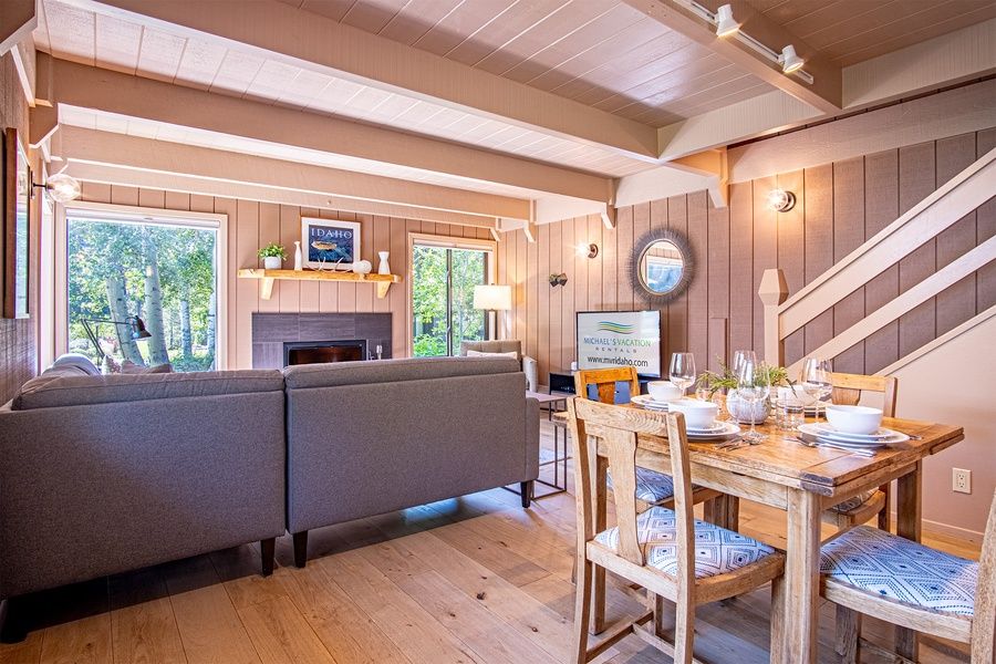 On arrival, you're welcomed by a large outdoor deck surrounded by Aspens and a seasonal creek - perfect for morning coffee, stargazing, or scenic Zoom calls with the office! A brand-new Edge electric grill is provided to comply with Sun Valley fire regulations. Inside, the living area beckons you to unwind – lose yourself in music through the Bluetooth speaker, engage in board games, catch up on your favorite shows, or simply cozy up fireside with friends and family.