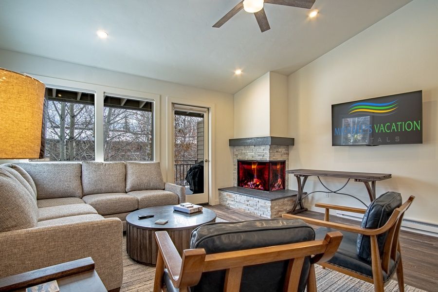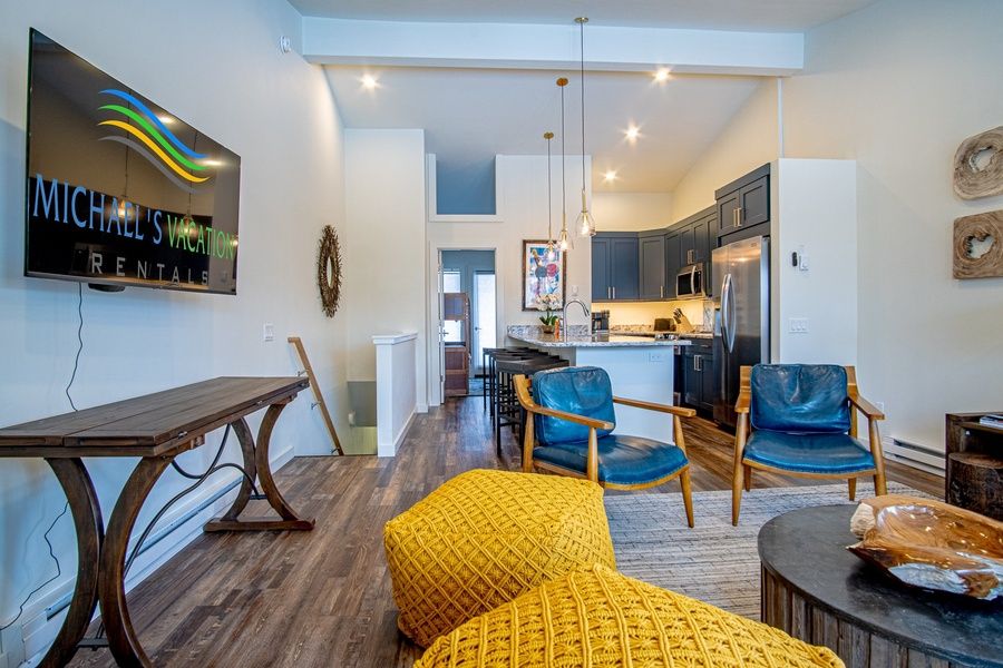 The condo is set over two stories with an open plan living area, ensuite bunk room, and spacious deck on the upper level, and two guest bedrooms downstairs. The cook in your crew will love the all-new kitchen, equipped with high-end stainless steel appliances and open to the living area for easy conversation. When you're not out exploring our local restaurant scene, imagine cozy nights at home watching movies by the fire … or sipping summer cocktails alfresco after a day of outdoor adventures.