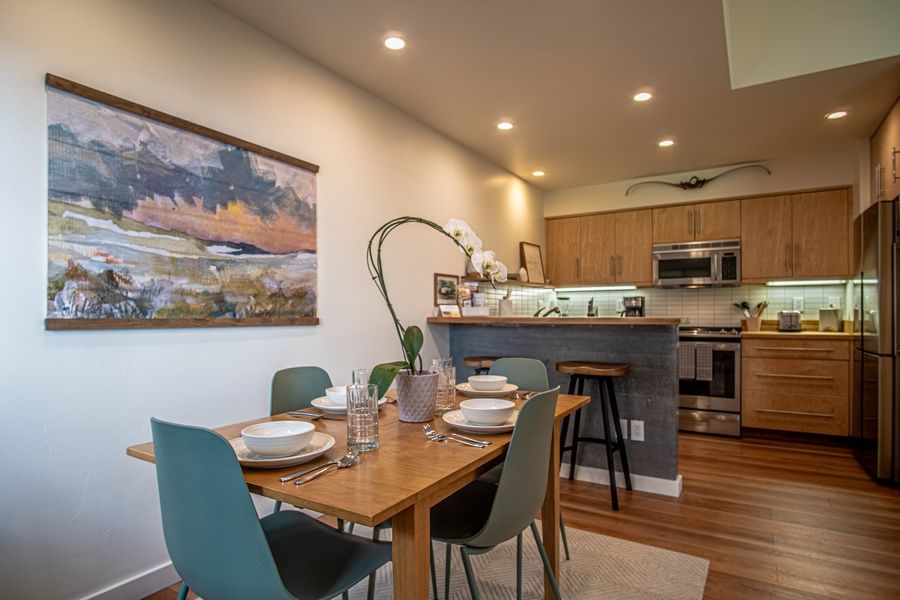 The main level is designed for easy downtime after mountain adventures. The open-plan living space features a cozy sofa, flat-screen Roku TV, Bluetooth speaker, and a gas fireplace to warm up winter evenings. The dining table seats four, with an additional breakfast bar for two. The modern kitchen is fully stocked for home-cooked meals - though with Ketchum's endless restaurants, you'll have plenty of dining options nearby.