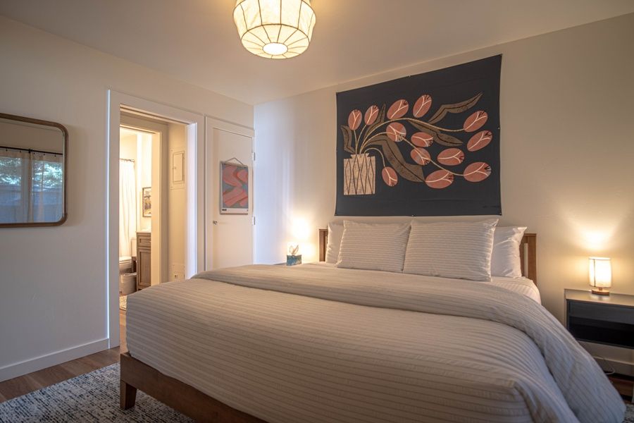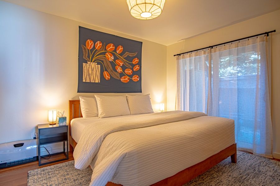 The primary bedroom is located just off the living area. It features a king bed, an ensuite bathroom with a walk-in shower, and sliding doors that lead out to a private deck furnished with Adirondack chairs - perfect for sipping morning coffee or enjoying a glass of wine at sunset.