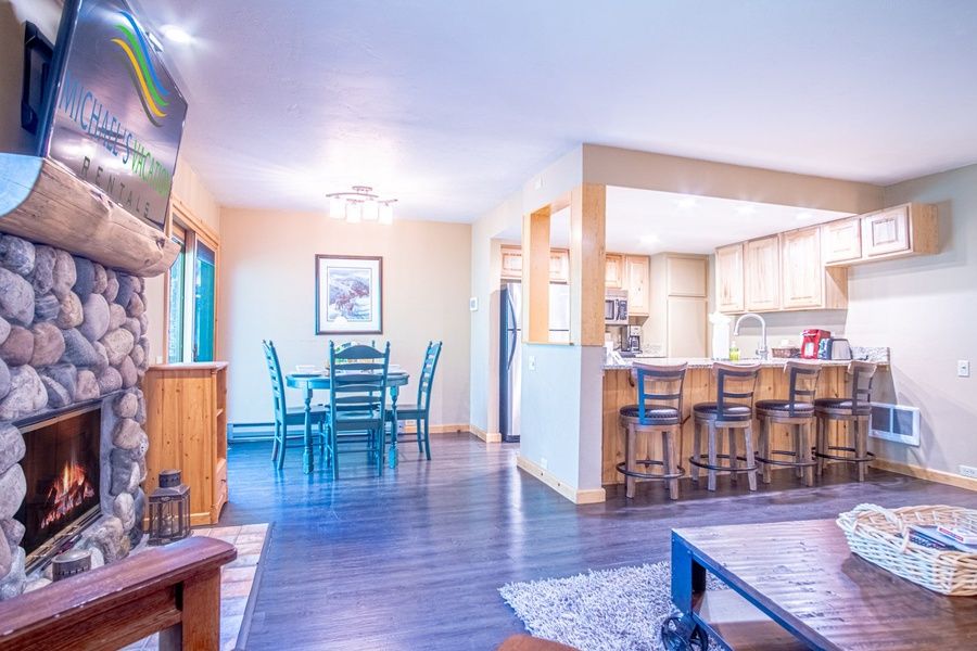 This 800 sq foot Horizons 4 condo was recently remodeled with your vacation experience in mind. The living area is open plan and cozy with warm wood flooring, lush leather furniture, and a queen hide-a-bed for extra guests. There's a gas fireplace for winter warmth and a flat screen TV for downtime at the end of a day of outdoor activities in scenic Sun Valley. The modern updated kitchen is fully equipped with stainless steel appliances and a granite breakfast counter with seating for 4 guests.