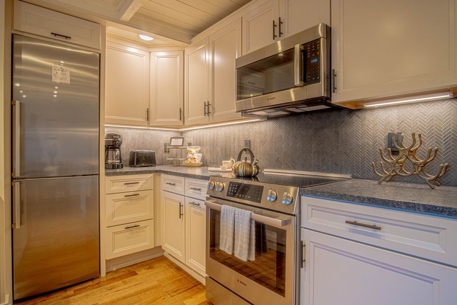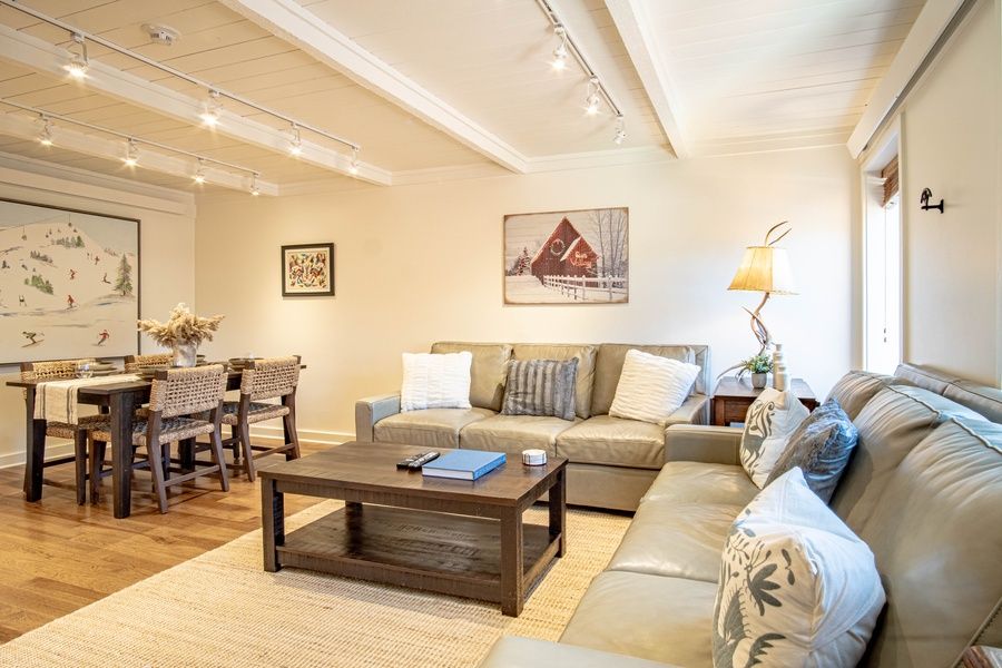 Step inside to a bright and inviting open concept living area complete with comfy leather sofas, a Smart TV with cable, and a dining area perfect for gathering after a day on the slopes or trails. The sleek, fully equipped kitchen has everything you need to prepare home-cooked meals or enjoy morning coffee while admiring the views of Baldy.
