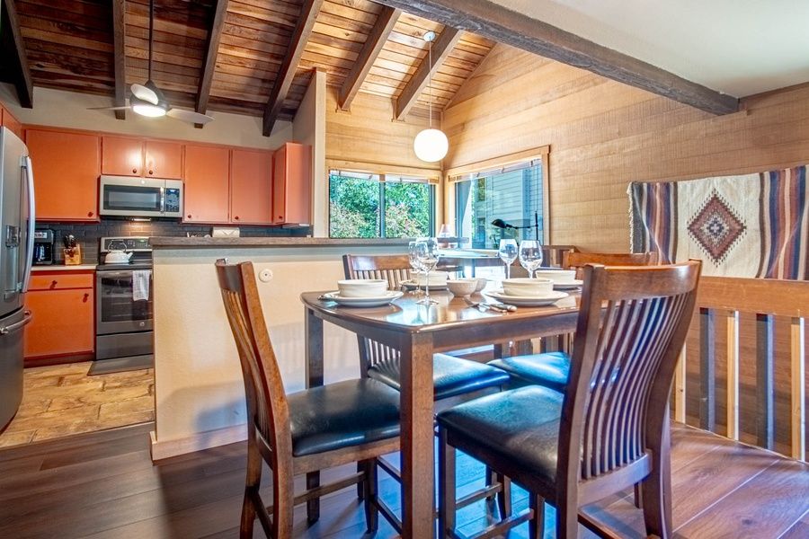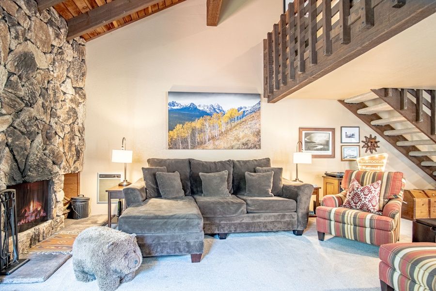 The open great room features vaulted ceilings, wood-paneled walls, a stunning stone fireplace, and ample space for the whole crew to relax and unwind. Take advantage of a convenient fully-equipped kitchen for home-cooked meals, enjoy alfresco dining out on the deck, or hop on the free shuttle to explore 40+ restaurants in Sun Valley and downtown Ketchum. Please note that due to fire restrictions this condo does not have a BBQ. Communal barbeques are available in the clubhouse.