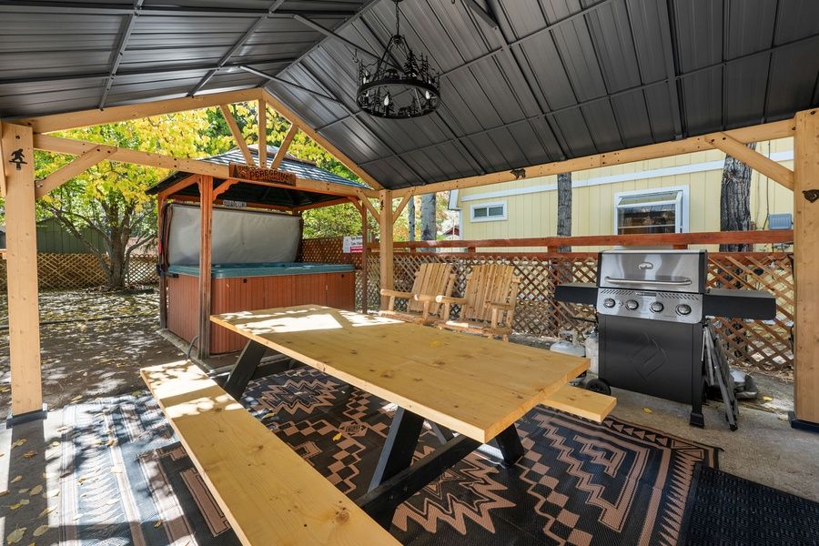 OUTDOORS - Fully fenced backyard ideal for children and pets. Towering trees provide a peaceful canopy, and the bubbling jacuzzi under a gazebo if perfect for unwinding. Enjoy the deck and outdoor seating for morning coffee or evening gatherings surrounded by nature.