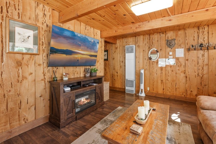 LIVING SPACE – Comfortable 840+ sq ft home with a spacious living room, Smart TV, dining area, and a stunning rock wood-burning fireplace. High beamed ceilings and luxury laminate wood flooring create a warm and inviting mountain ambiance. A mini-split AC system in the main living area offers a much sought-after amenity in Big Bear.