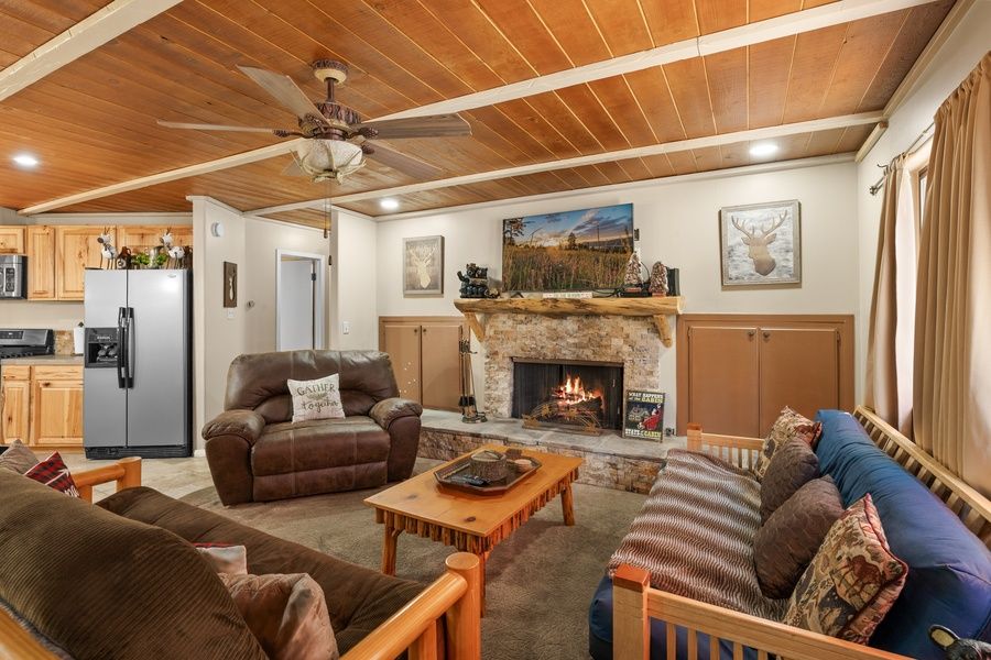 LIVING SPACE - Spacious 1300+ sq ft home with living room, dining table, TV with cable, gas fireplace, ceiling fan, and plenty of comfortable living room seating.