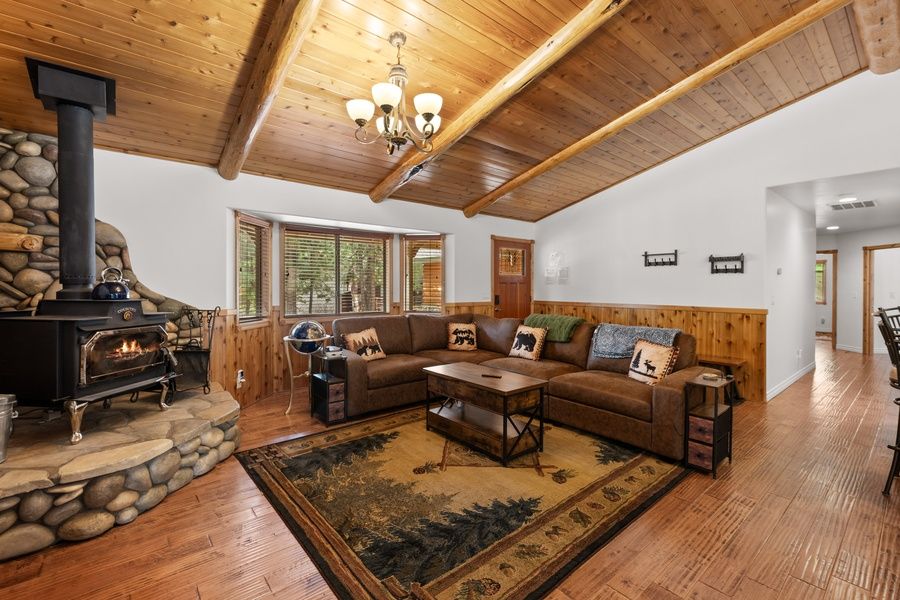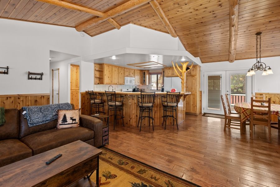 This welcoming single-story cabin is perfect for families, friends, or anyone seeking a quiet mountain retreat. Located in a desirable area of Big Bear Lake, it features soaring wood-beamed ceilings, rich log siding, and a spacious deck for entertaining. Just minutes from shops, dining, and outdoor adventures, this home has everything you need for a relaxing getaway!