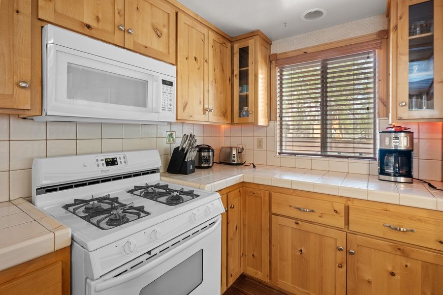 KITCHEN – Full kitchen with all essential appliances, maple cabinetry, large breakfast bar, refrigerator, stove/oven, microwave, dishwasher, toaster, rice cooker, coffee maker, dishes, pots/pans, and more.