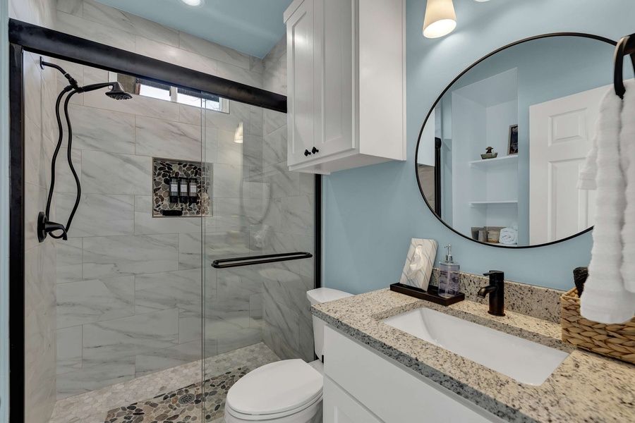 The bedrooms feature a plush king bed for restful sleep, while the sleek bathrooms offer a walk-in shower for added comfort.