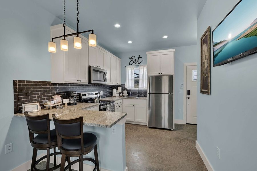 Each thoughtfully designed unit includes everything you need for a relaxing stay. Whip up a favorite meal in the well-equipped kitchen, then enjoy it at the countertop with two barstools perfect for casual dining. In the living area, a cozy sofa invites you to unwind with a glass of local wine after a day of exploring.