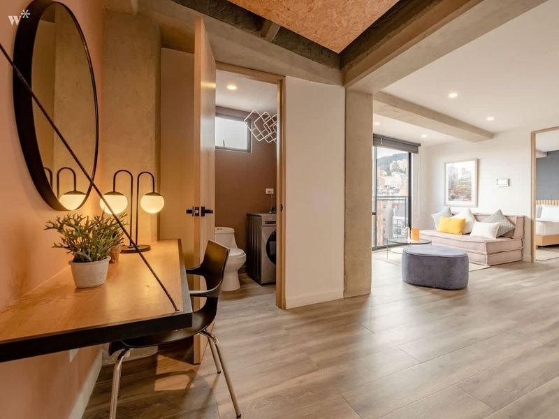 This 60 m^2 apartment in Chapinero is designed for upscale guests seeking to immerse in the city's vibrant culture without sacrificing an exclusive living experience. Tailored for both short and long stays, the apartment offers a unique blend of industrial colors and minimalistic design, creating a sophisticated urban aesthetic. Keyed elevator access provides direct entry from the lobby to the apartment, ensuring privacy and convenience.