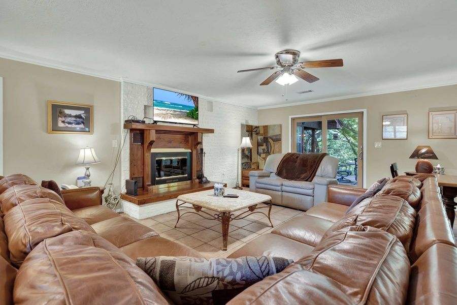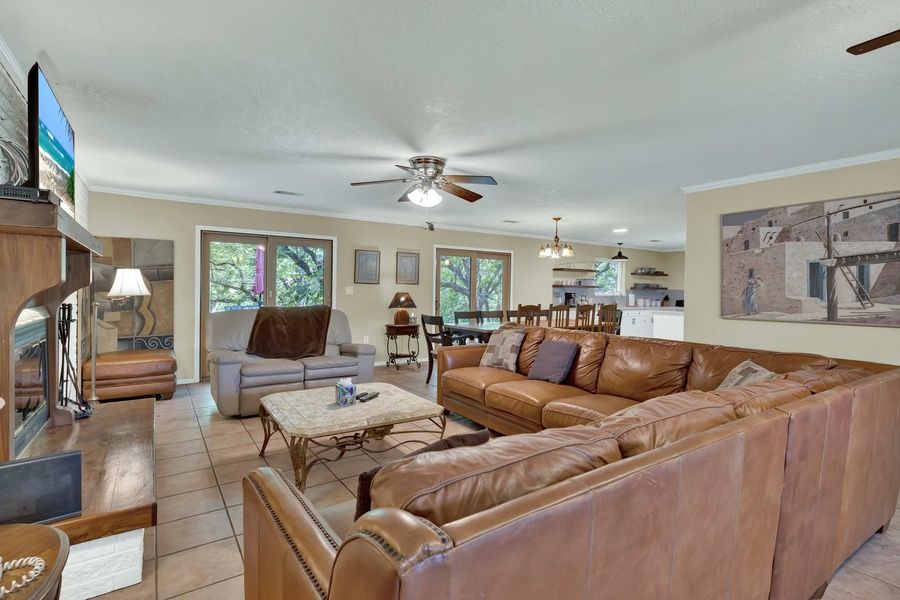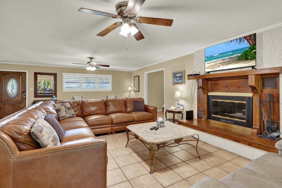 The living room offers a warm and inviting space to relax, featuring a large sectional sofa perfect for stretching out or gathering with family and friends. A cozy loveseat adds extra seating, making it easy to settle in for a movie night, casual conversation, or a quiet afternoon with a good book. This comfortable setup creates the ideal space for connection and relaxation.