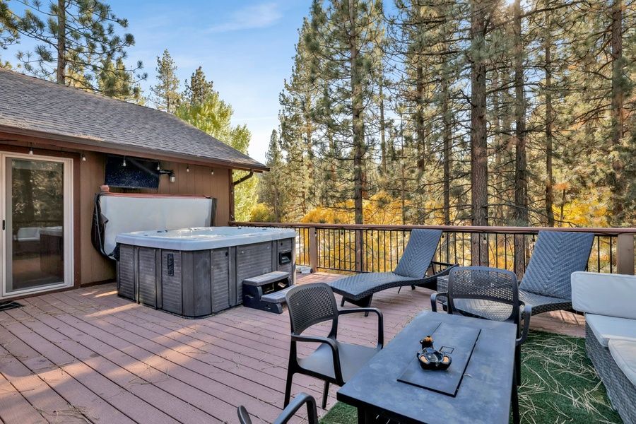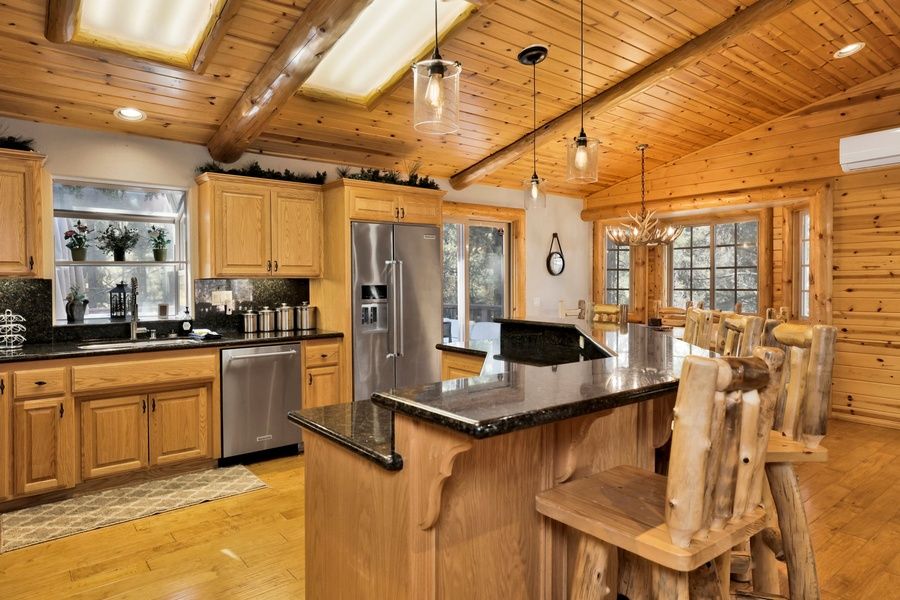Nestled in a private, tree-filled setting backing up to the new Rathburn Creek Trail, this spacious cabin invites you to relax in style. The open-concept great room features knotty pine T&G ceilings, log accents, and a floor-to-ceiling stone fireplace — the perfect spot to gather after a day on the slopes. Enjoy a movie night or cozy up with a cup of cocoa while snow falls outside. The gourmet kitchen comes fully equipped with granite countertops, a breakfast bar, and new KitchenAid stainless steel appliances, making it easy to cook and entertain. The adjacent dining area opens to a large deck with a private hot tub, BBQ grill, outdoor TV, and peek-a-boo ski slope views — perfect for après-ski evenings or summer barbecues.