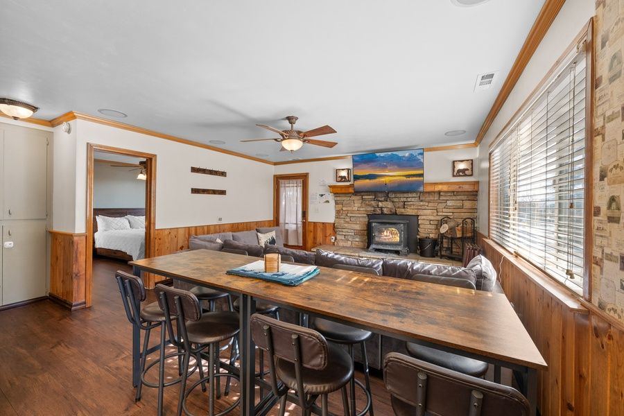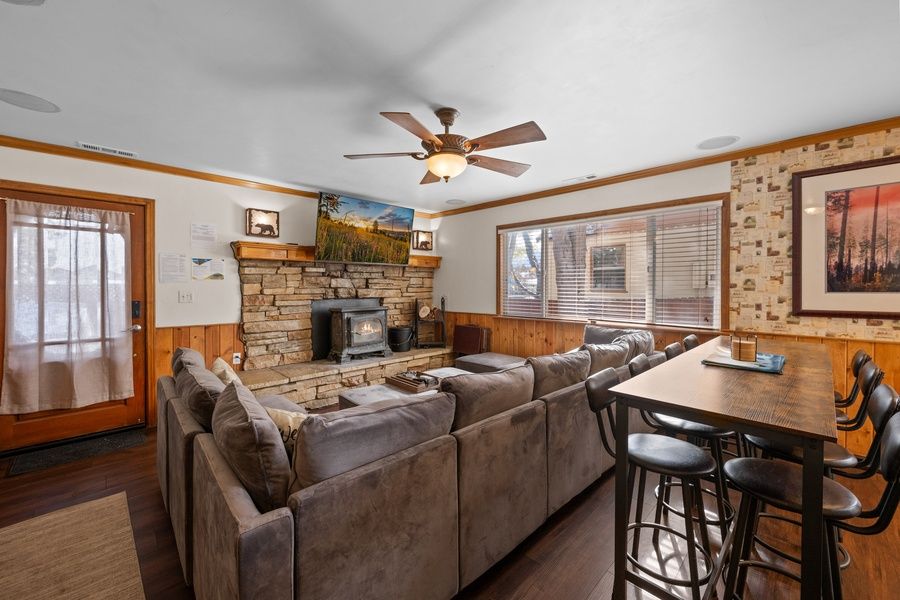LIVING SPACE - Comfortable 900+ sq ft home with living room, ceiling fan, dining table, smart TV, wood burning stove fireplace, and plenty of comfortable living room seating.