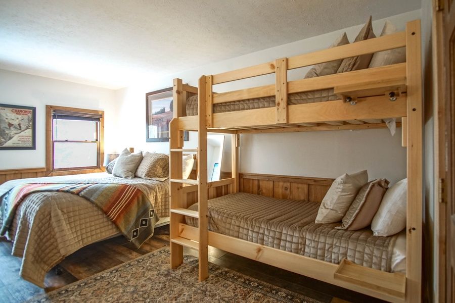 WHISTLEPUNK -11 - 2 BEDROOMS, 2 BATHS: BEDDING: Master BR Pillowtop King Bed and Bunk, flat screen TV, private full bath, BR -2 1 Twin Bed, 1 Pyramid Bunk Bed, a sleeper sofa in the living room, flat screen TV, BluRay DVD. Ski Storage Entry, Wood Fireplace (wood provided), and Washer/Dryer. Level Floor Plan on grade with the parking lot. Down one flight of stairs to the ski trails.