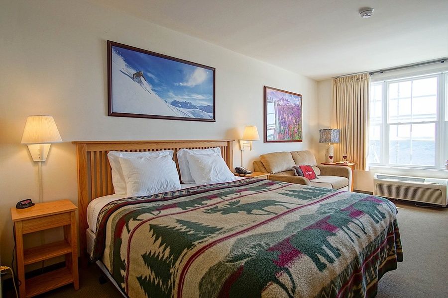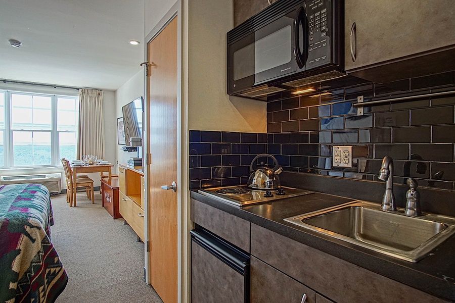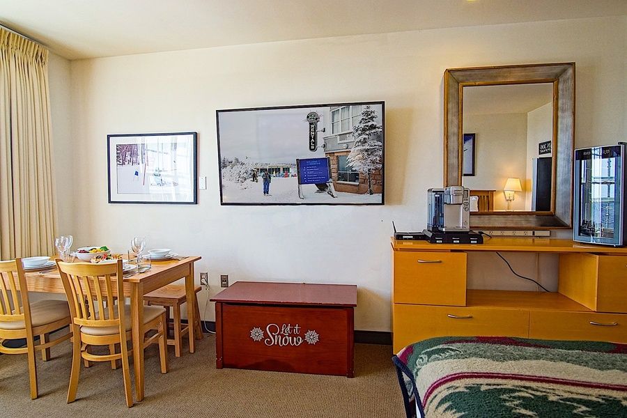 Expedition Station -306: 1 Bedroom Junior Studio - Pillow top King Bed, Queen Sleeper Sofa, Full Bath. Spectacular 60" Samsung HDTV SmartTV, with BluRay DVD. Dining Table for 4. Wine Cooler, Kitchenette suitable for light breakfasts and lunches. Microwave oven, under-counter refrigerator, 2 burner cooktop, NO OVEN. Convenient location in the Village next door to Ski and Snowboard School, shops, and restaurants.