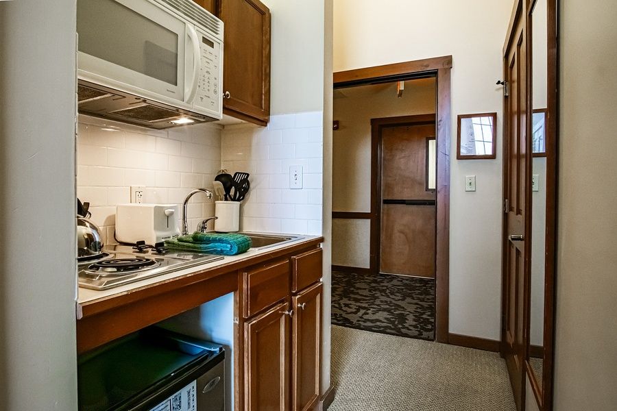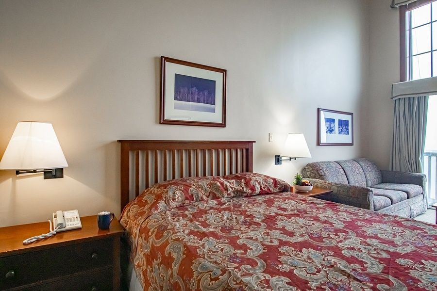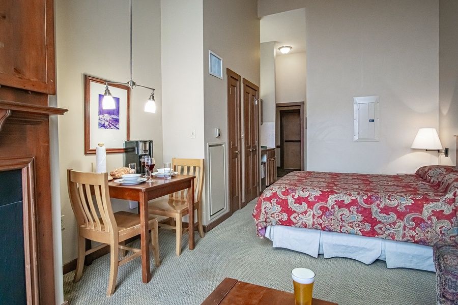 ALLEGHENY SPRINGS # 414 - Junior Queen Studio- 1 QB,1SS - This classic Studio room will sleep 2-4 people. It is located on the 4th floor within the heart of the Snowshoe Village. This condo is a traditional room with a small sitting area, a kitchenette, and also a gas fireplace. The condo has a full-sized Bath, 1 Queen Bed, and a Sleeper Sofa. A small Balcony overlooks the village.