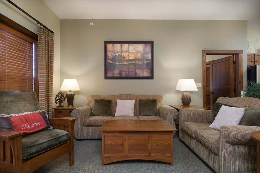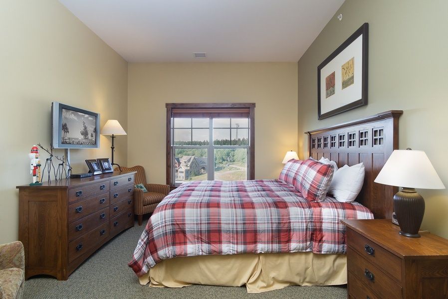 SOARING EAGLE 406 - 2 BEDROOM, 2 BATHS - BEDDING: MASTER Pillowtop King Bed, flat screen TV, private bath with oval soaking tub and separate shower in the Master Suite; BR 2 Pyramid Bunk Bed (double down/twin up), plus another twin bed. Big flat screen TV with BluRayDVD. Their own private full bathroom. PLUS: Queen sofa bed in Living Room. 50" flat screen TV/DVD, Gas Fireplace and Washer/Dryer. Enjoy mountain views from the top of Snowshoe Mountain in this charming 2 bedroom east facing condo. 2 seat bar, 6 seat dining table, queen sleeper sofa, 50 inch flat screen TV/DVD, gas fireplace, fully equipped kitchenette, 2 full bathrooms and a small furnished patio.