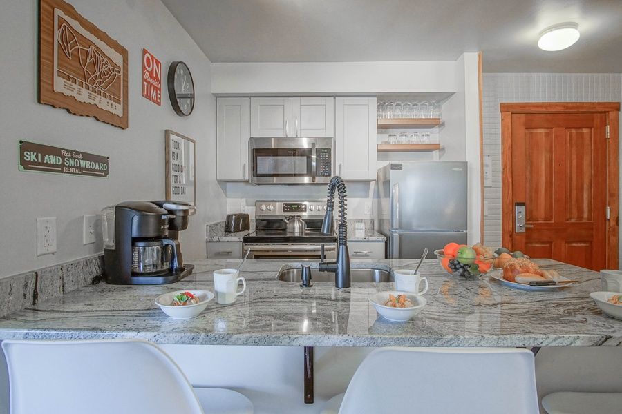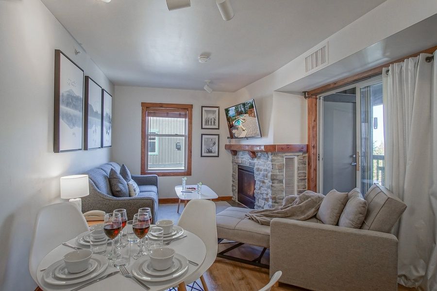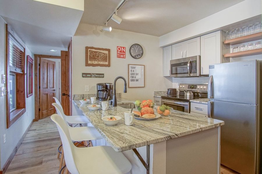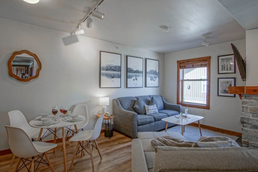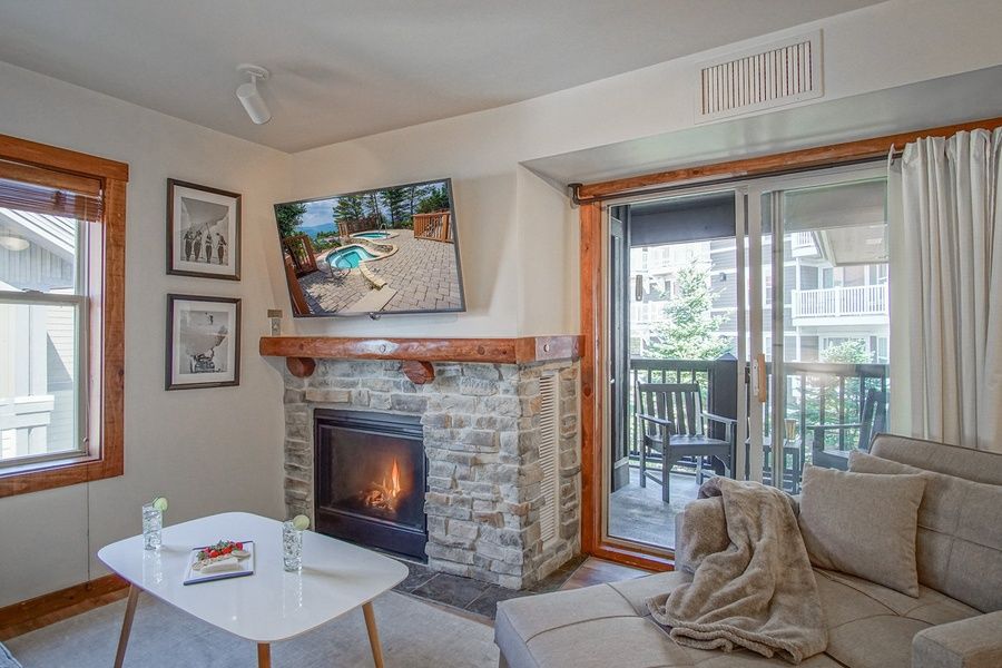 Rimfire 342 - 1 BEDROOM, 1 BATH - QUEEN, TWIN SLEEPER CHAIR AND A QUEEN SLEEPER SOFA - SLEEPS 5. Located right in the heart of the Village. Enjoy the best that Snowshoe Mountain Resort has to offer. Step out the door of your condo and enjoy dining, shopping, and Spa services. Set on the private deck and enjoy great views of the village and enjoy concerts in the plaza. It has a full kitchen with stainless steel dishwasher, stove, and refrigerator. The living room has a gas fireplace with a sleeper sofa, a twin sleeper chair, and a 50 inch smart TV. Queen bed in the bedroom with a 50 inch smart TV. The bathroom has a walk-in shower.