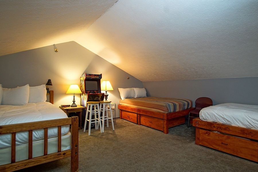MOUNTAIN CREST 35 (THE TREEHOUSE) - 1 BEDROOM, 1 BATH - BEDDING: This unit has a Queen sleeper sofa in the living room. The loft area has 2 full-size beds and a Queen bed. The unit comfortably sleeps 6. Nestled among the treetops, this unit has everything you need to enjoy your stay at Snowshoe Mountain. Located atop the Highland Ridge, Mountain Crest is approximately a 3-minute or 100-yard walk to the Powderidge lift, approximately 1 mile from the Village. It features a full kitchen, including stainless steel microwave, stove, dishwasher, refrigerator, and granite counters. A private balcony with wooded views and a wood-burning fireplace, with firewood available outside in the parking lot. The loft has a queen and 2 full-size beds, a Mortal Kombat Arcade cabinet, XBOX, BlueRay player, DVDs, and board games. Caution: The stairs leading to the loft are steep. NO AIR CONDITIONING