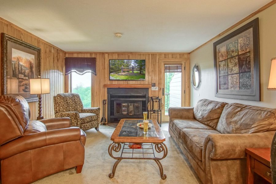 POWDERIDGE 14 - 2 BEDROOM TOWNHOUSE, 2.5 BATHS - BEDDING: MASTER Bedroom: King Bed, TV/DVD, private bath; Bedroom 2: Pillowtop Queen Bed, TV/DVD. Large Flat Screen TV/DVD and Queen size sofa bed in the Living Room. Two story townhouse with a Living Room, Dining Area and Half Bath on the main floor. Washer/Dryer. wood fire place (wood provided). A large exterior deck overlooks the slopes. Ski gear storage entry.
